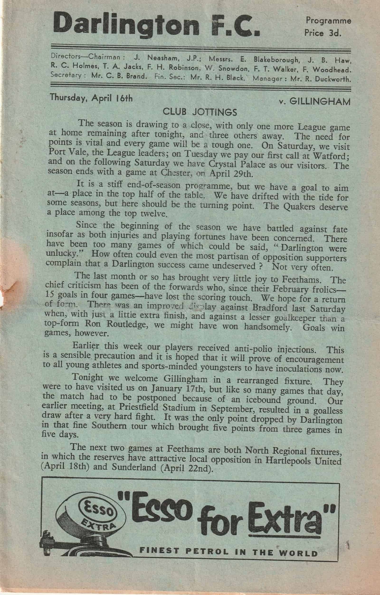 Match: Darlington v Gillingham Competition: League Division 4 Date: 16-Apr-1959 Comments: Rating: 3 Condition: Hole on spine due to disintegrated staples, rust bleed, discolouring on edge of programme Weight in grams: 40