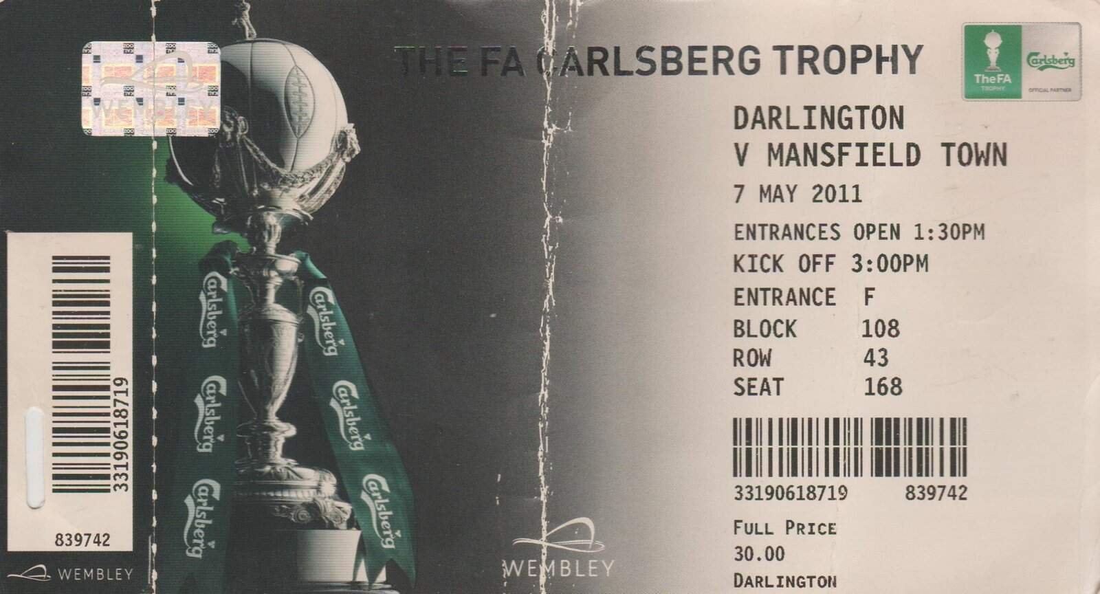 Match: Darlington v Mansfield Town Competition: FA Trophy Final Date: 07-May-2011 Comments: Rating: 3 Condition: Crease Weight in grams: 10