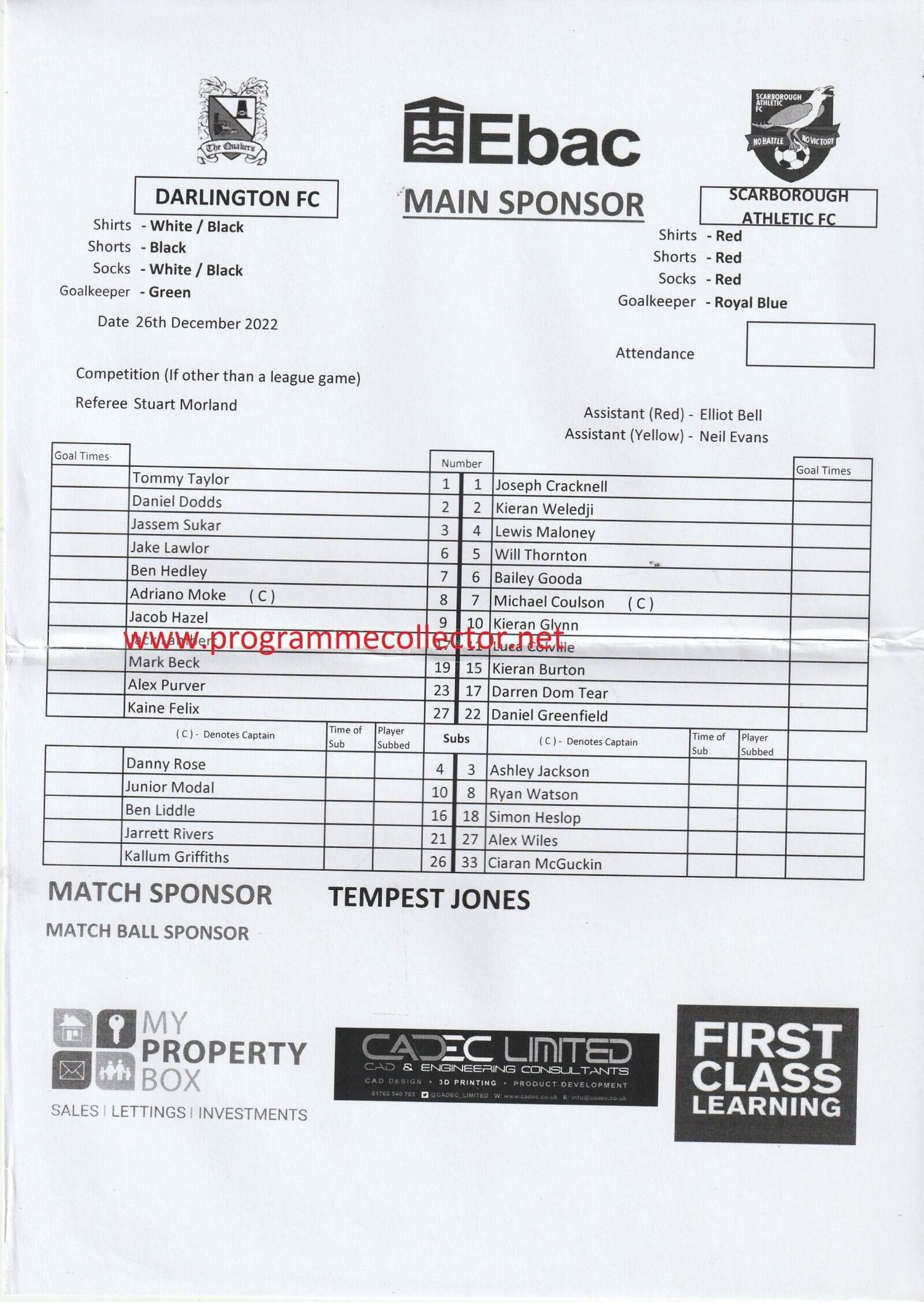 Match: Darlington v Scarborough Athletic Competition: Vanarama National League North Date: 26-Dec-2022 Comments: Rating: 4 Condition: Fold Weight in grams: 20