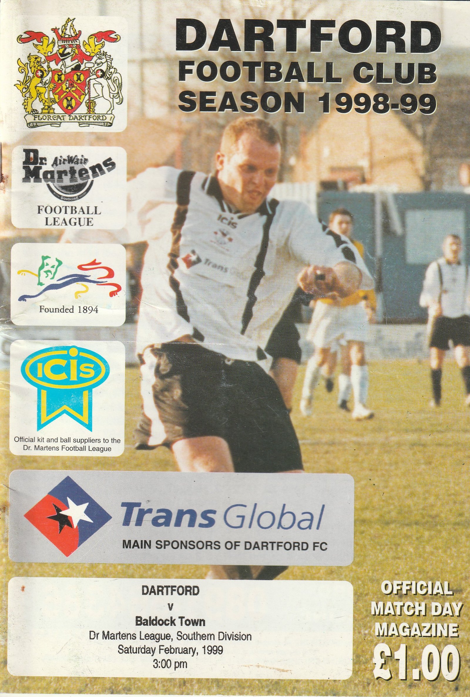 Match: Dartford v Baldock Town Competition: Dr Martens League Southern Division Date: 20-Feb-1999 Comments: Rating: 3 Condition: Rusty staples Weight in grams: 100