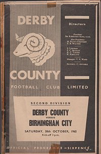 Match: Derby County v Birmingham City Competition: League Division 2 Date: 30-10-1965 Comments: Rating: 2 Condition: Cellotape on spine and edge of cover, slight corner tear, Pin hole,Rusty Staples Weight in grams: 40