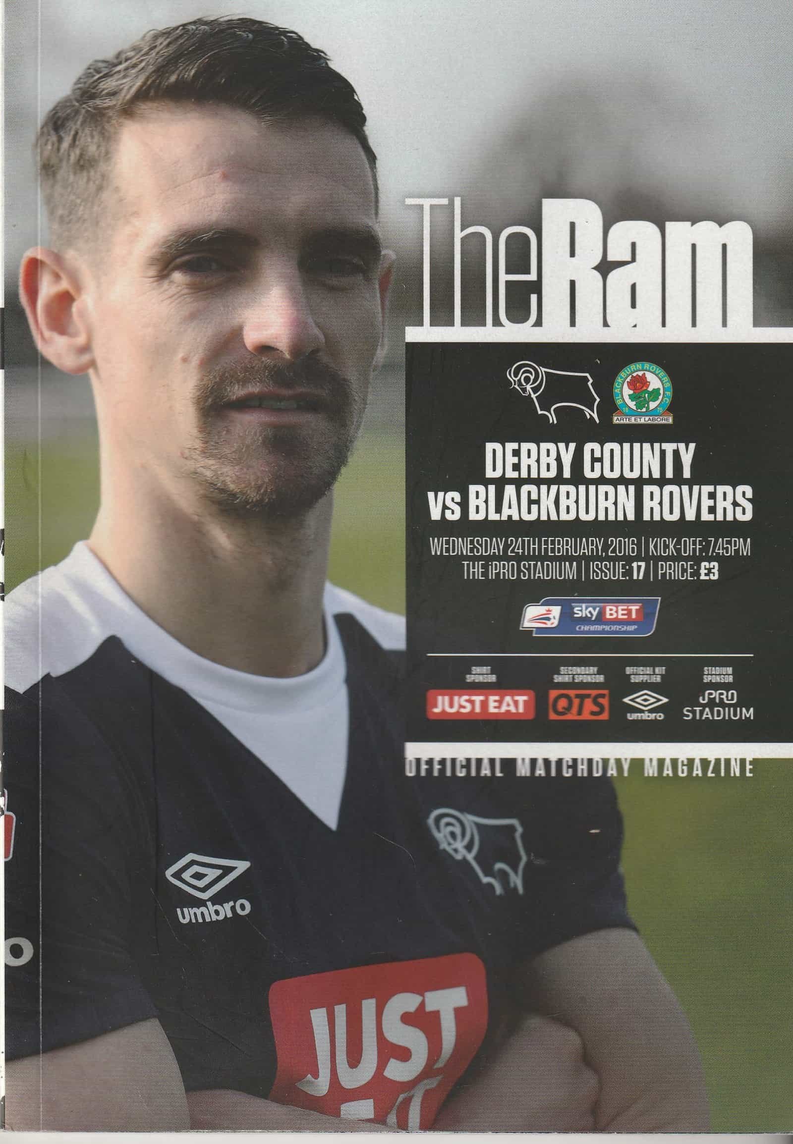 Match: Derby County v Blackburn Rovers Competition: SkyBet Championship Date: 24-Feb-2016 Comments: Rating: 4 Condition: Very good Weight in grams: 240