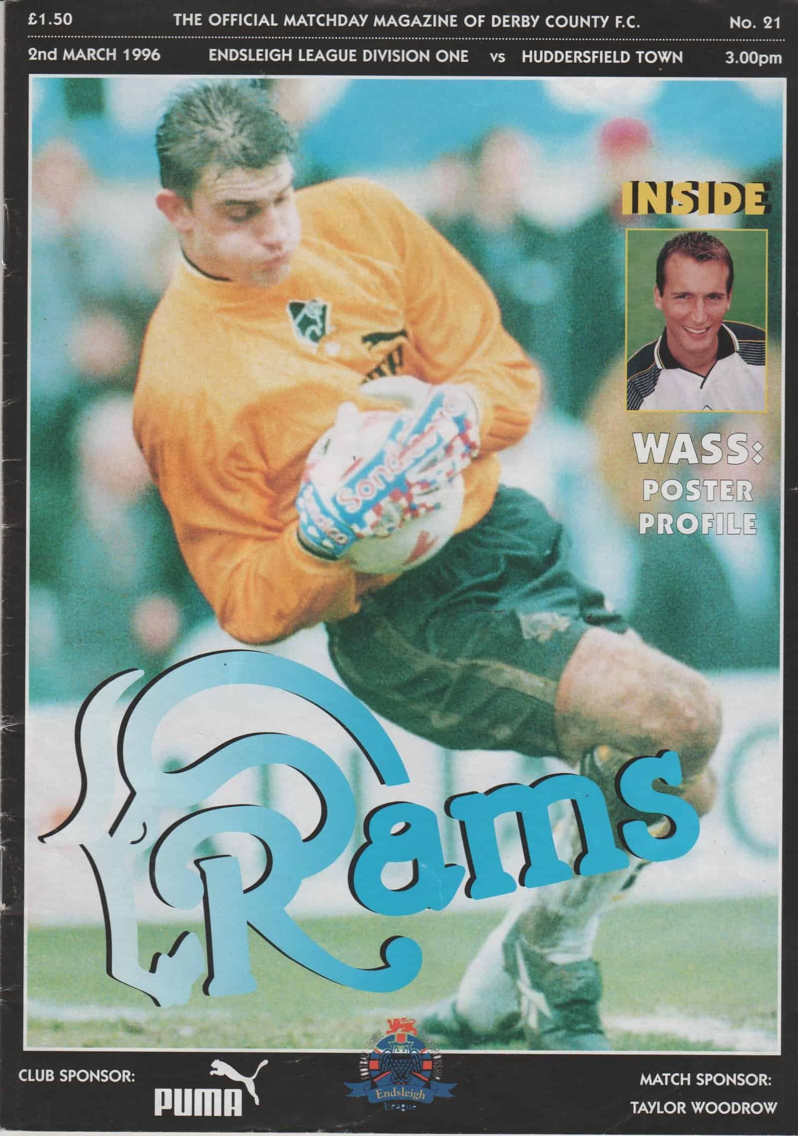 Match: Derby County v Huddersfield Town Competition: League Division 1 Date: 02-Mar-1996 Comments: Rating: 3 Condition: Team changes, faint fold Weight in grams: 100