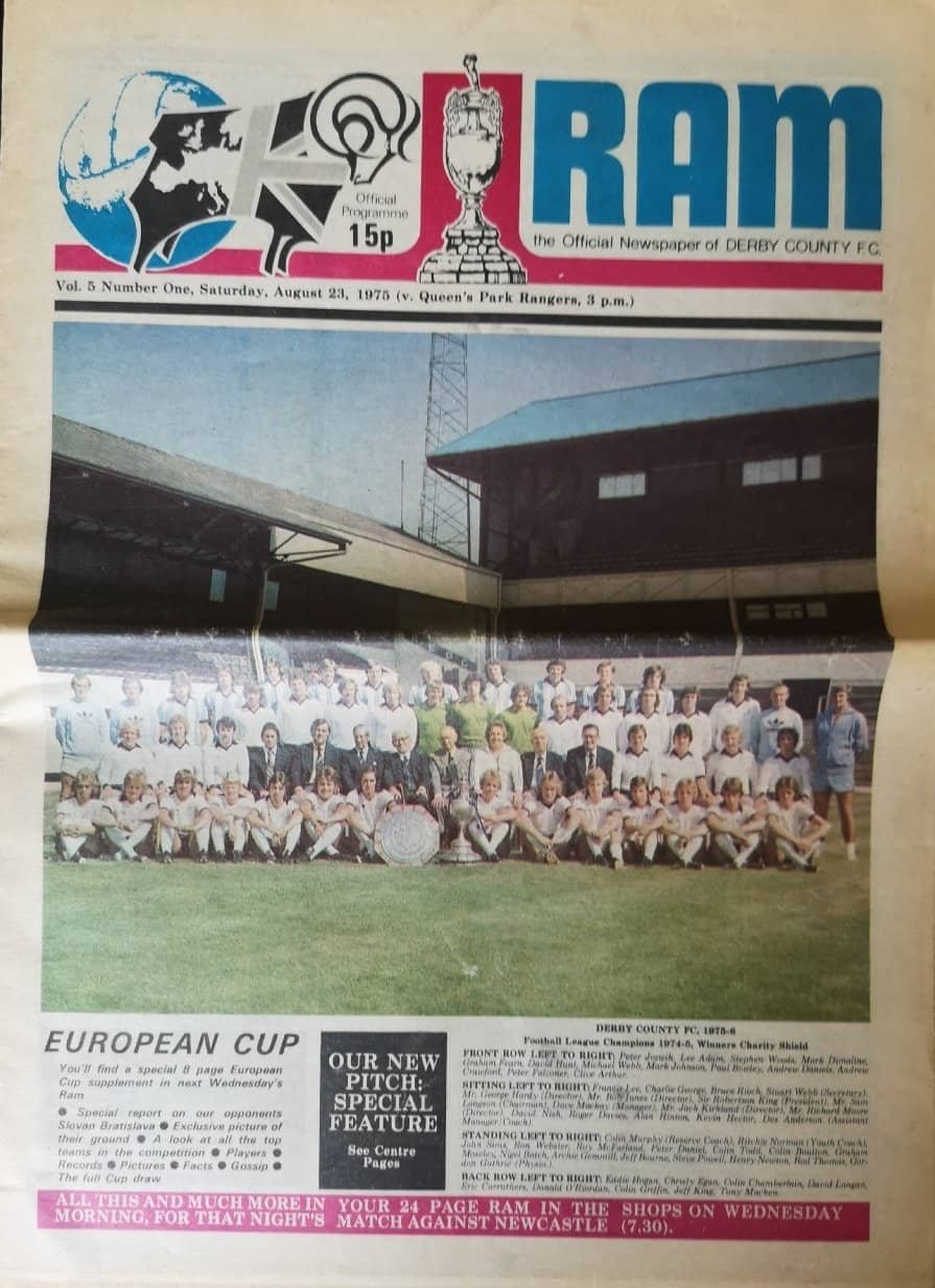 Match: Derby County v Queens Park Rangers Competition: League Division 1 Date: 23-Aug-1975 Comments: Folded newspaper issue Rating: 3 Condition: Browning around edges, tears and nicks on edge of pages Weight in grams: 160