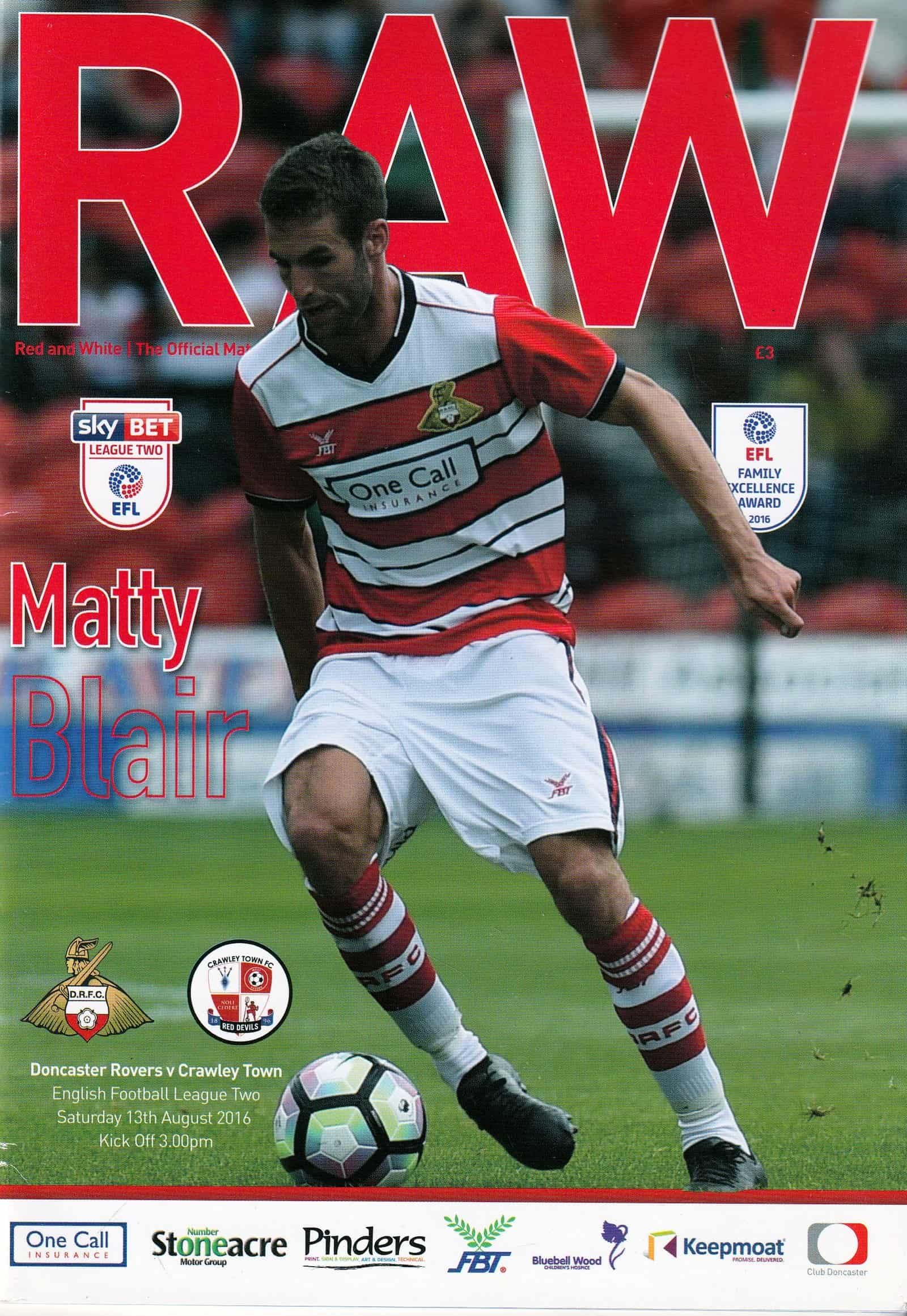 Match: Doncaster Rovers v Crawley Town Competition: SkyBet League 2 Date: 13-Aug-2016 Comments: Rating: 4 Condition: Very good Weight in grams: 160