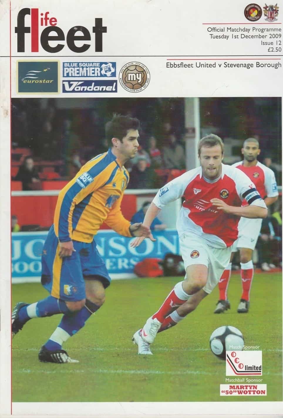 Match: Ebbsfleet United v Stevenage Borough Competition: Blue Square Premier Date: 01-Dec-2009 Comments: Rating: 3 Condition: Small nick on top edge of cover, slight marks on edges of pages2 and 3 Weight in grams: 160