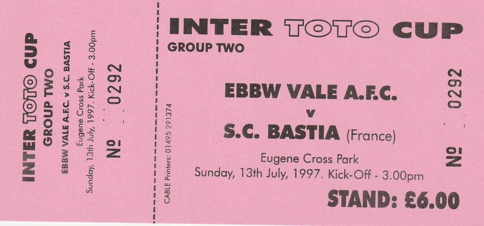 Match: Ebbw Vale v Bastia Competition: Intertoto Cup Group 2 Date: 13-Jul-1997 Comments: Rating: 4 Condition: Very good Weight in grams: 20