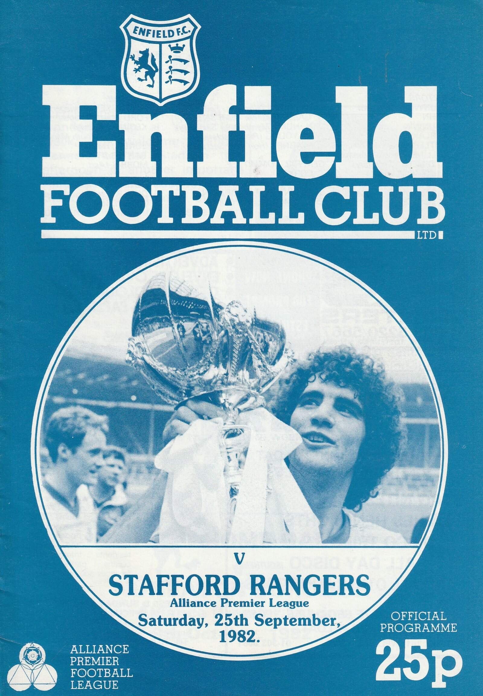 Match: Enfield v Stafford Rangers Competition: Alliance Premier Division Date: 25-Sep-1982 Comments: Rating: 4 Condition: Very good Weight in grams: 80