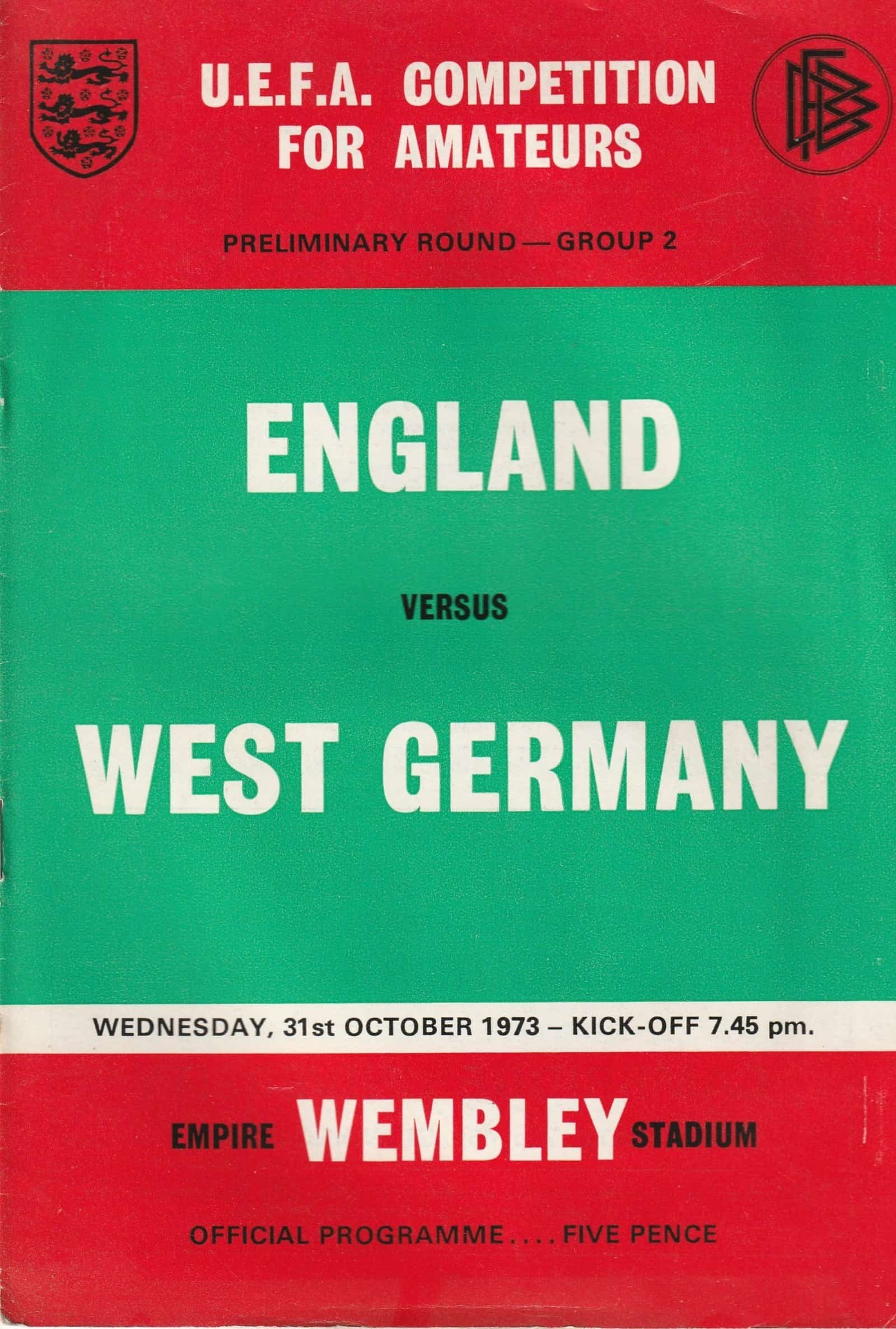 Match: England Amateurs v West Germany Amateurs Competition: UEFA Competition for Amateurs Preliminary Round Group 2 Date: 31-Oct-1973 Comments: Rating: 3 Condition: Curving on edge of programme Weight in grams: 100