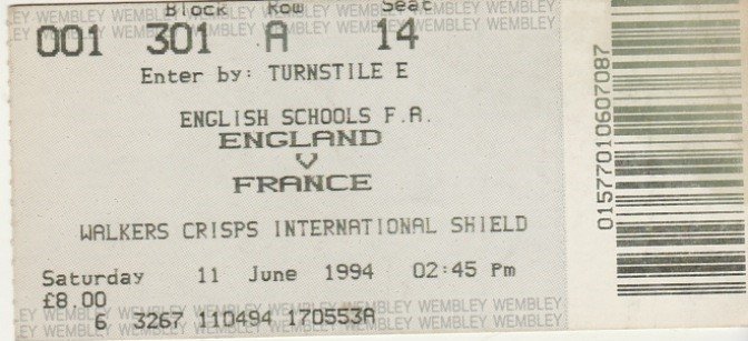 Match: England Schoolboys v France Schoolboys Competition: International Schools Friendly Date: 11-Jun-1994 Comments: Rating: 4 Condition: Very good Weight in grams: 10