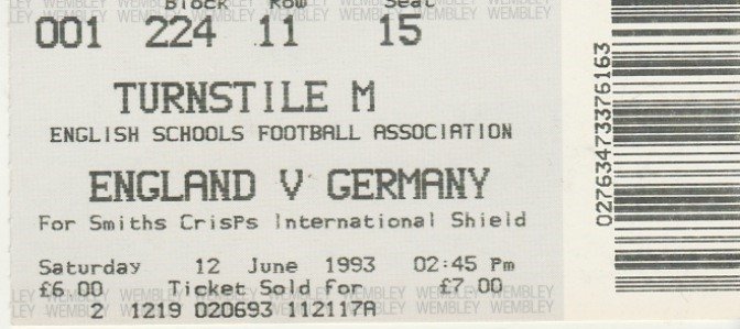 Match: England Schoolboys v Germany Schoolboys Competition: International Schools Friendly Date: 12-Jun-1993 Comments: Rating: 4 Condition: Very good Weight in grams: 10