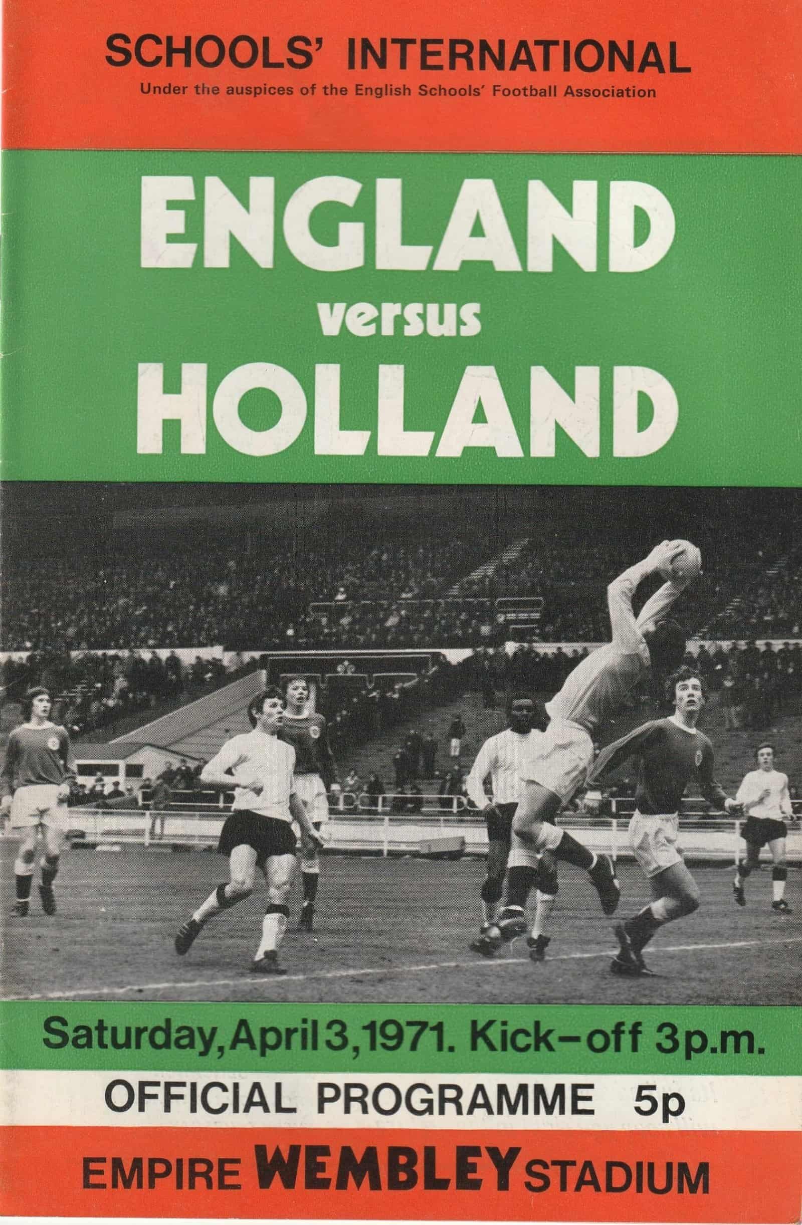 Match: England Schoolboys v Holland Schoolboys Competition: International Schools Friendly Date: 03-Apr-1971 Comments: Rating: 4 Condition: Very good Weight in grams: 100