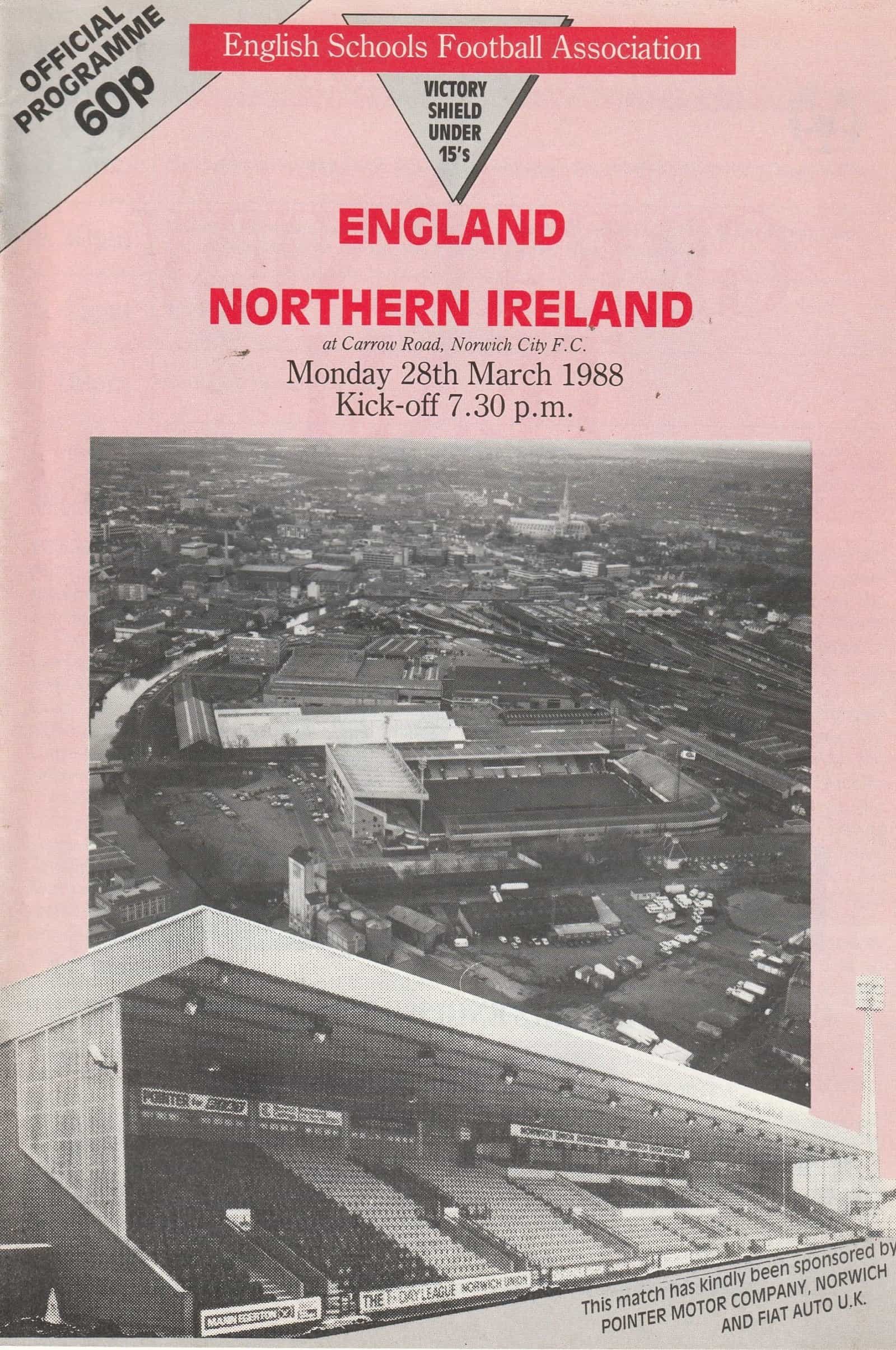 Match: England Schoolboys v Northern Ireland Schoolboys Competition: Schoolboy International Friendly Date: 28-Mar-1988 Comments: Played at Norwich City FC Rating: 4 Condition: Very good Weight in grams: 60