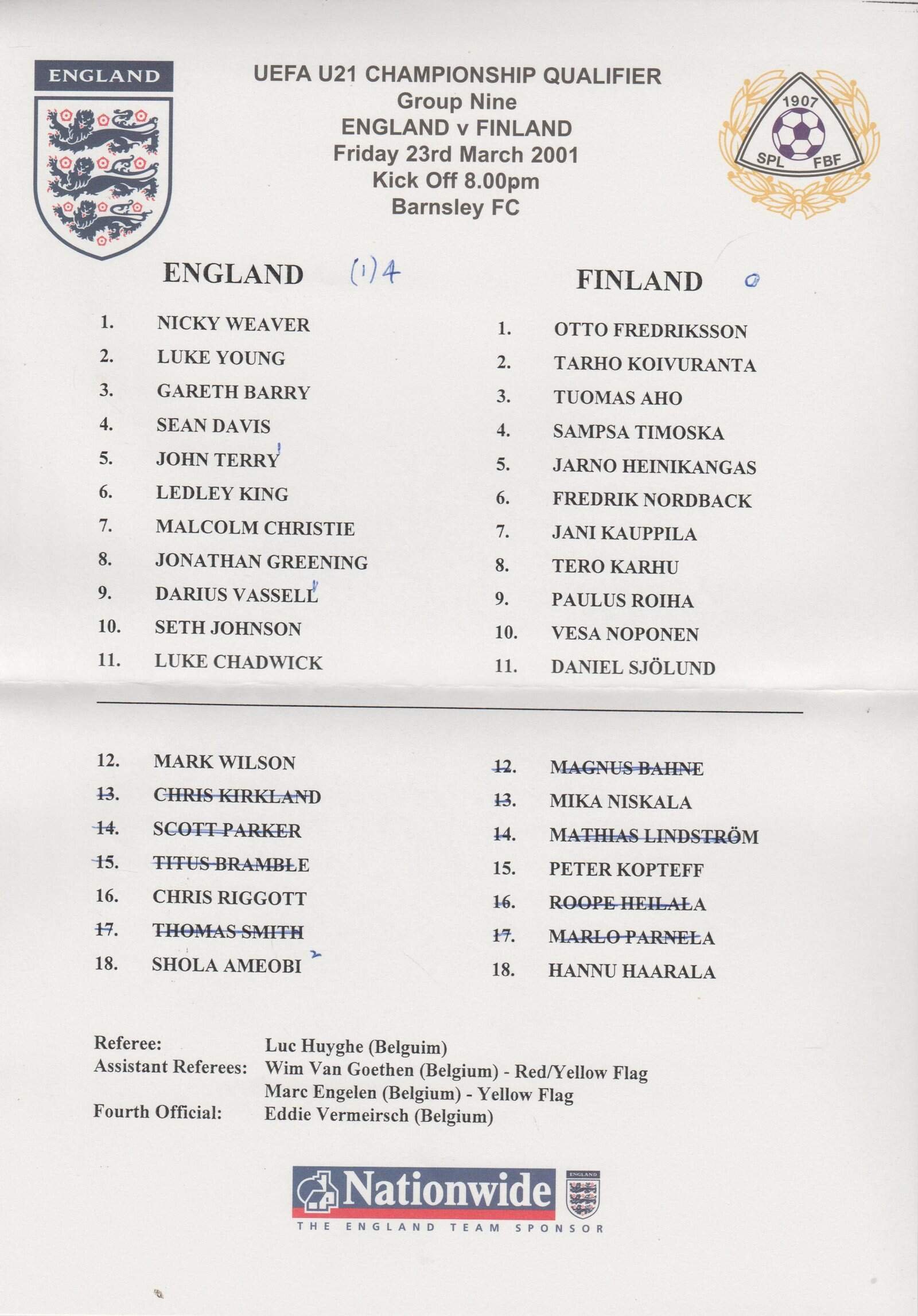 Match: England u21 v Finland u21 Competition: UEFA U21 European Championship Qualifier Group 9 Date: 23-Mar-2001 Comments: Rating: 3 Condition: Fold, score on face Weight in grams: 20