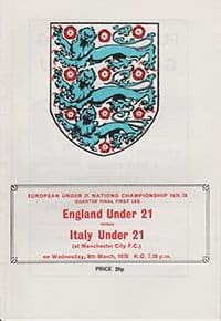 Match: England u21 v Italy u21 Competition: UEFA Under21 Championship Quarter Final 1st leg Date: 08-03-1978 Comments: at Manchester City FC Rating: 4 Condition: Very good Weight in grams: 60