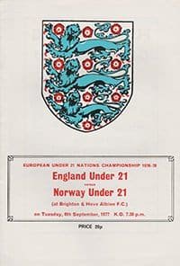 Match: England u21 v Norway u21 Competition: UEFA Under21 Championship Qualifier Date: 06-09-1977 Comments: at Brighton & HA FC Rating: 4 Condition: Very good Weight in grams: 60