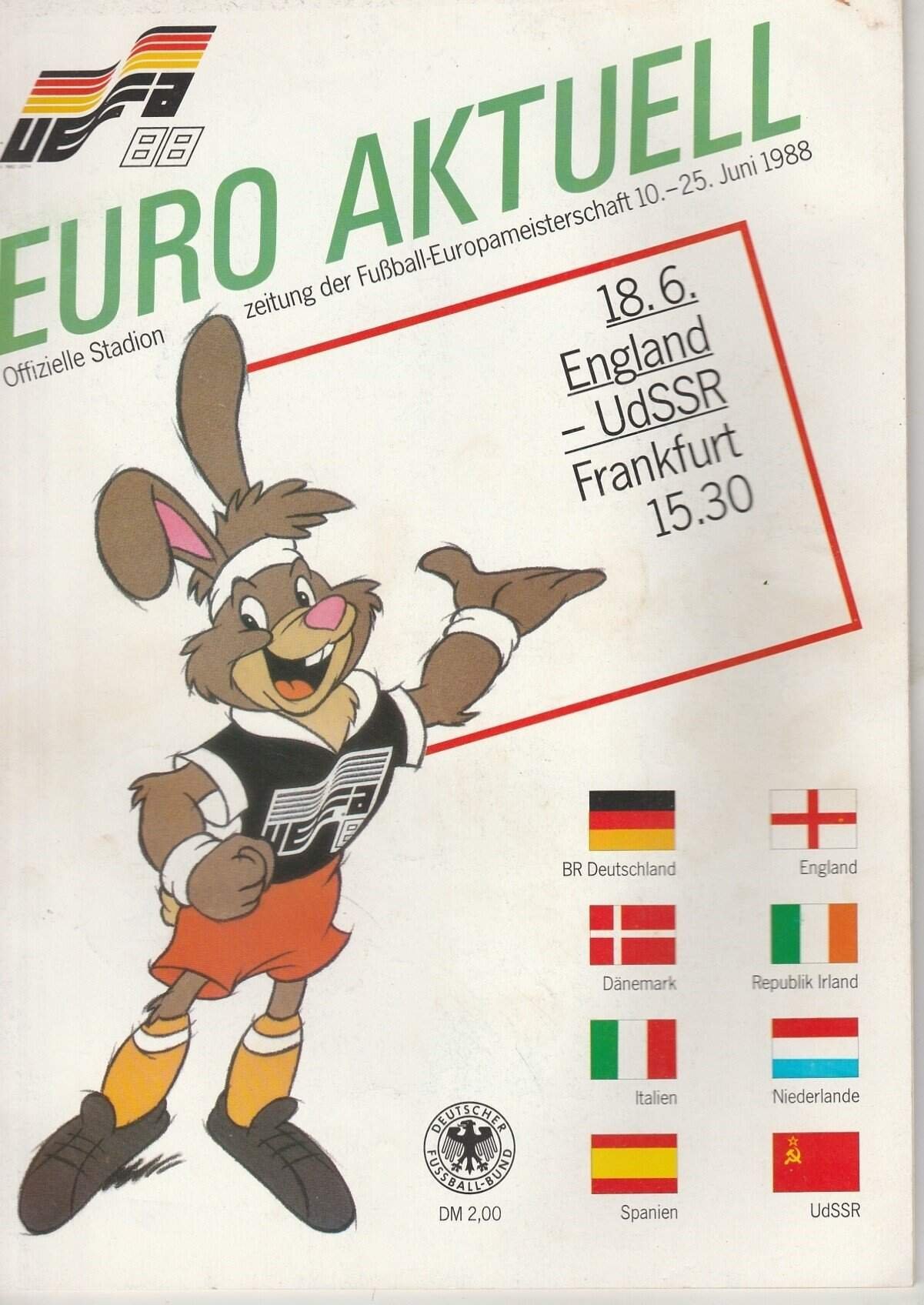 Match: England v Russia Competition: European Championship Finals Group 2 Date: 18-June-1988 Comments: Rating: 3 Condition: Light marks on cover Weight in grams: 200