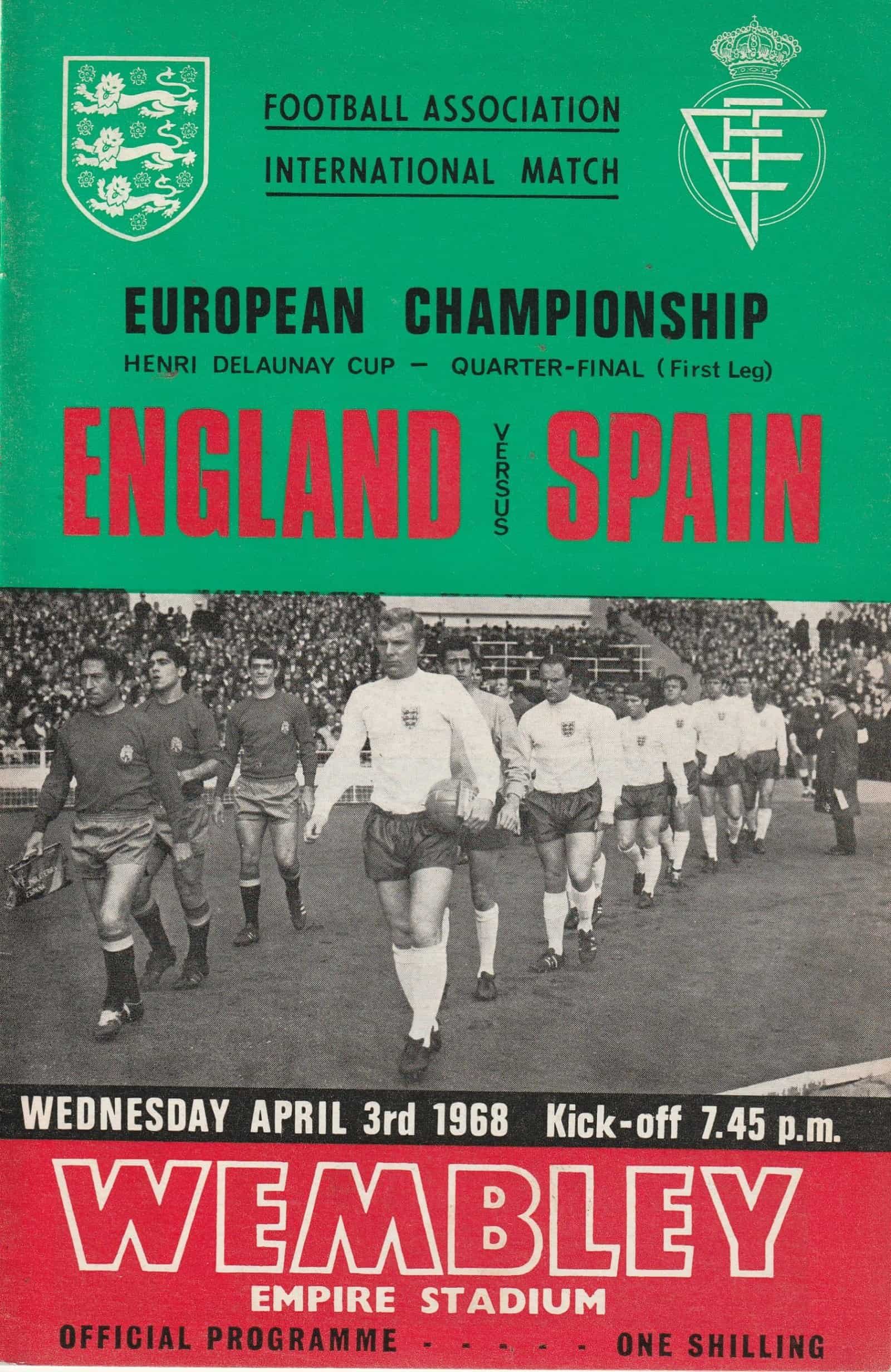 Match: England v Spain Competition: European Championship Quarter Final 1st leg Date: 03-Apr-1968 Comments: Rating: 4 Condition: Very good Weight in grams: 80