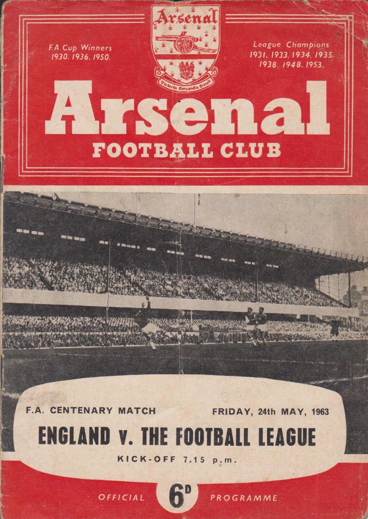 Match: England v The Football League Competition: FA Centenary Match – Friendly Date: 24-05-1963 Comments: at Arsenal FC Rating: 2 Condition: Grubby, writing inside, soiled, creased Weight in grams: 40