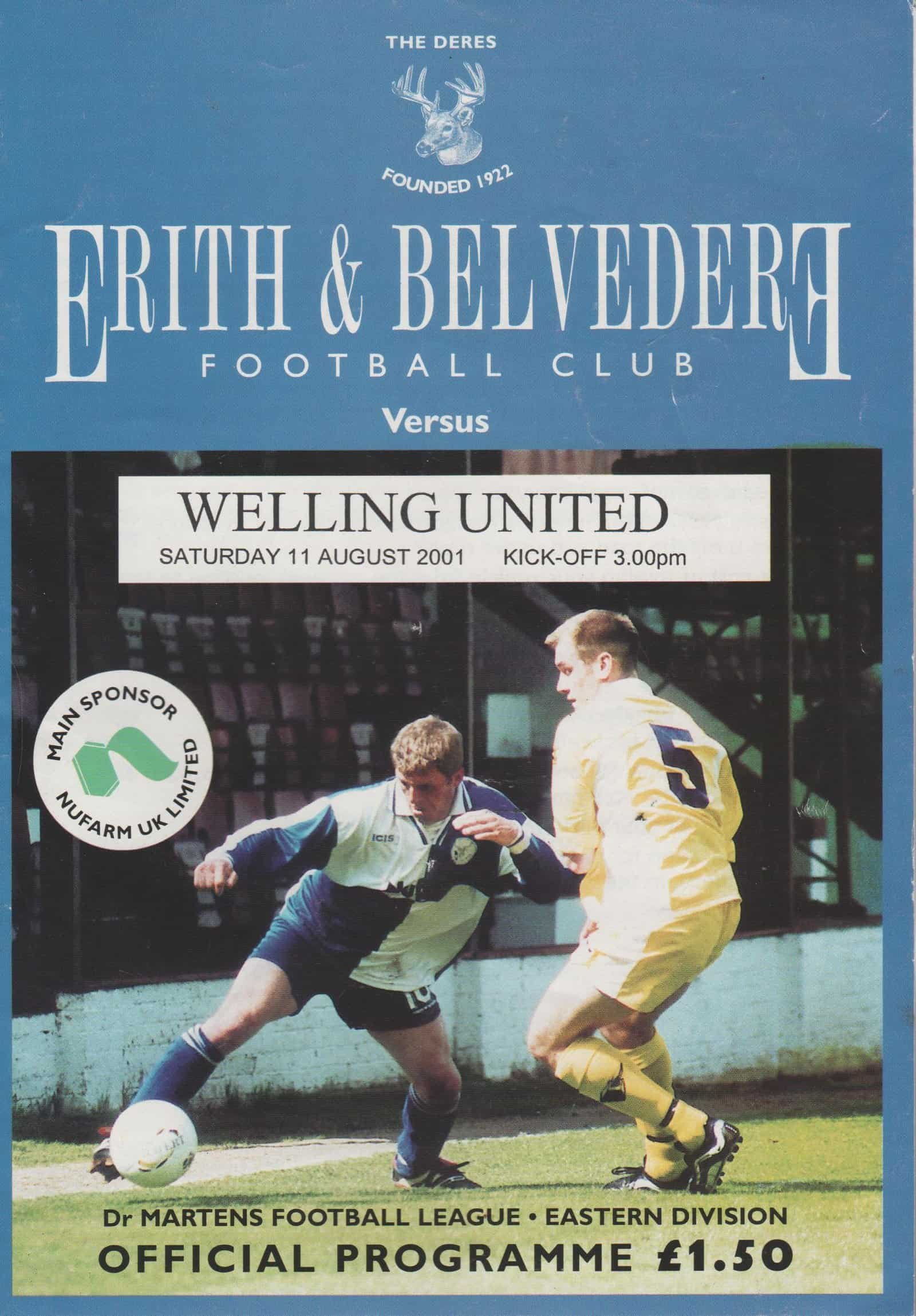 Match: Erith & Belvedere v Welling United Competition: Friendly Date: 11-Aug-2001 Comments: Rating: 3 Condition: Light handling wear Weight in grams: 40