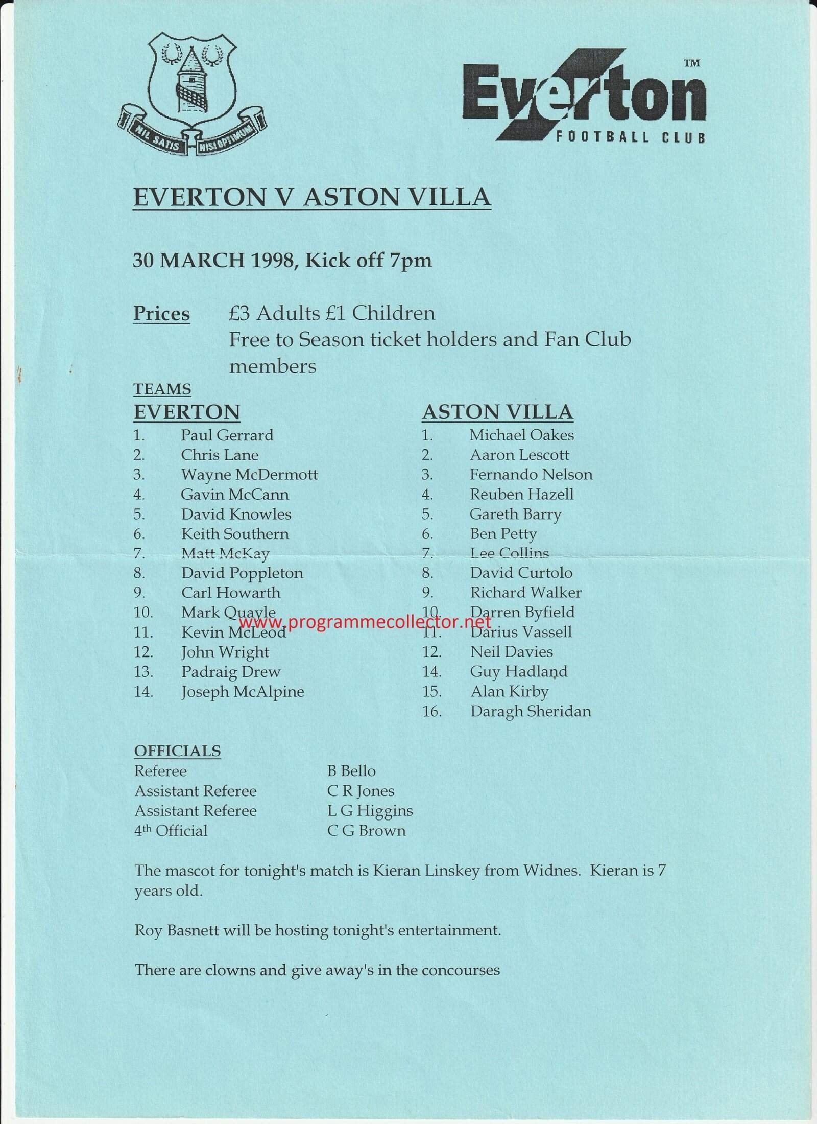 Match: Everton Reserves v Aston Villa Reserves Competition: Central League Date: 30-Mar-1998 Comments: Single sheet issue Rating: 3 Condition: Fold Weight in grams: 20