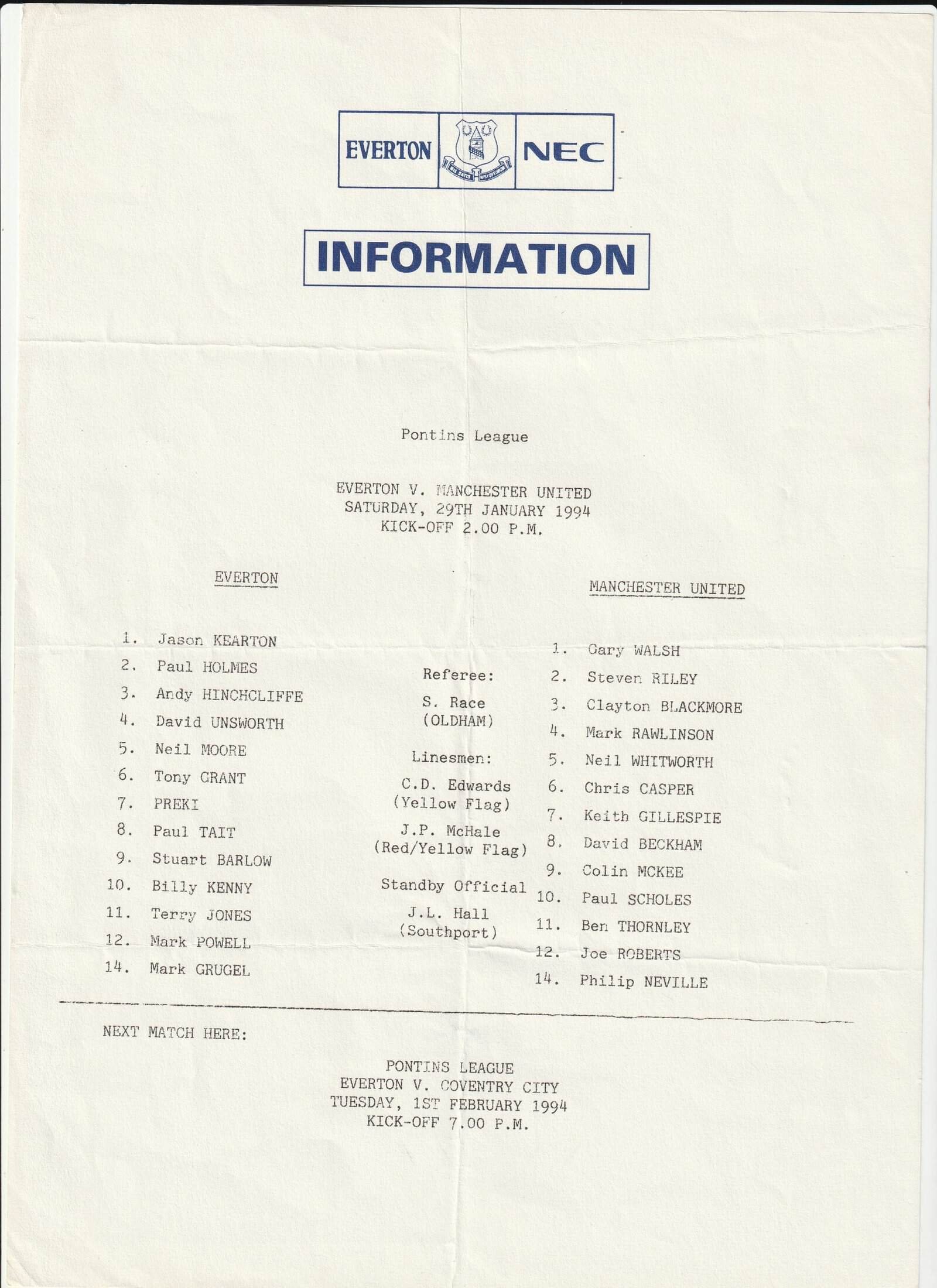 Match: Everton Reserves v Manchester United Reserves Competition: Pontins League Date: 29-Jan-1994 Comments: Single sheet issue Rating: 3 Condition: Folds Weight in grams: 20