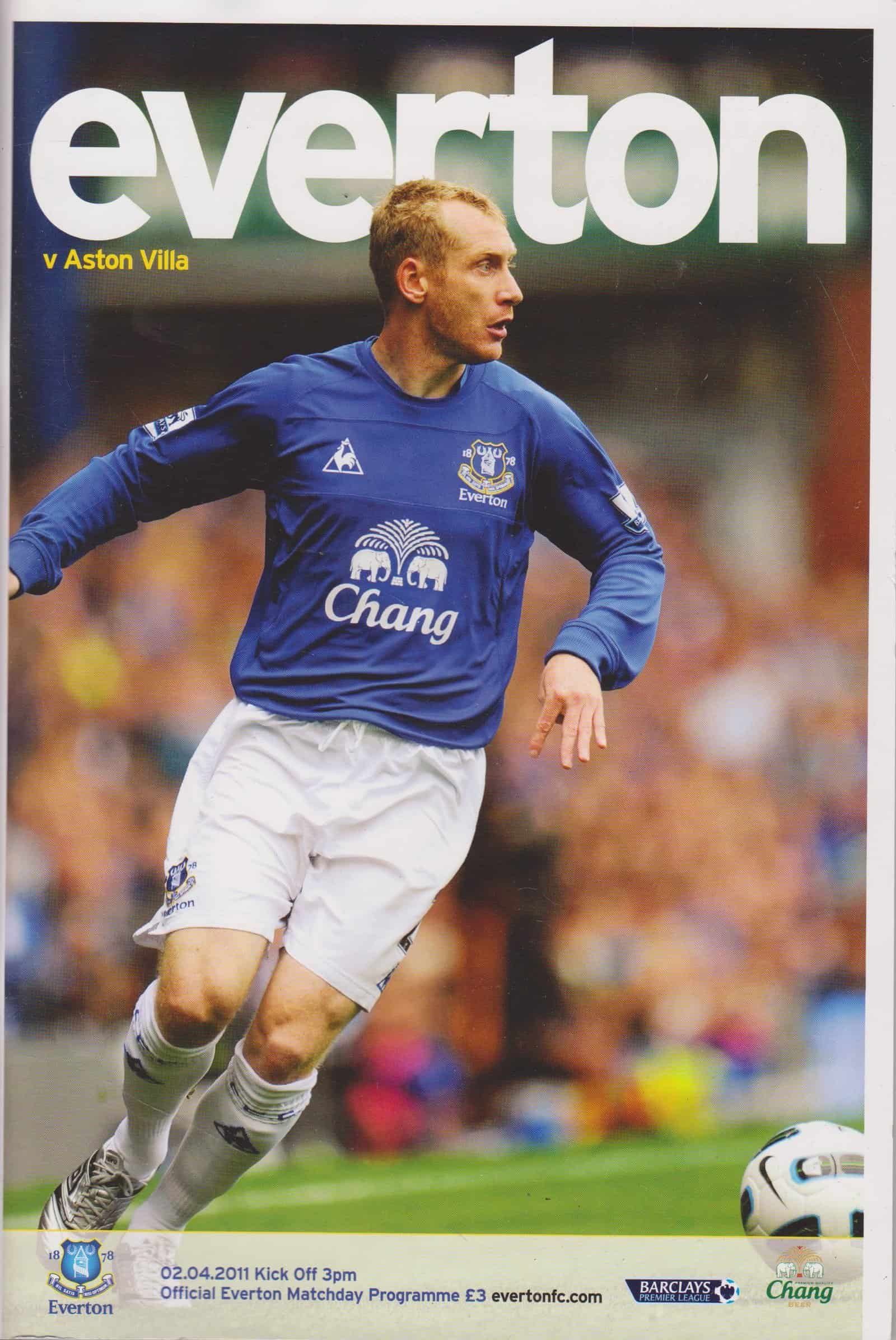 Match: Everton v Aston Villa Competition: Premier League Date: 02-04-2011 Comments: Rating: 5 Condition: Excellent Weight in grams: 200