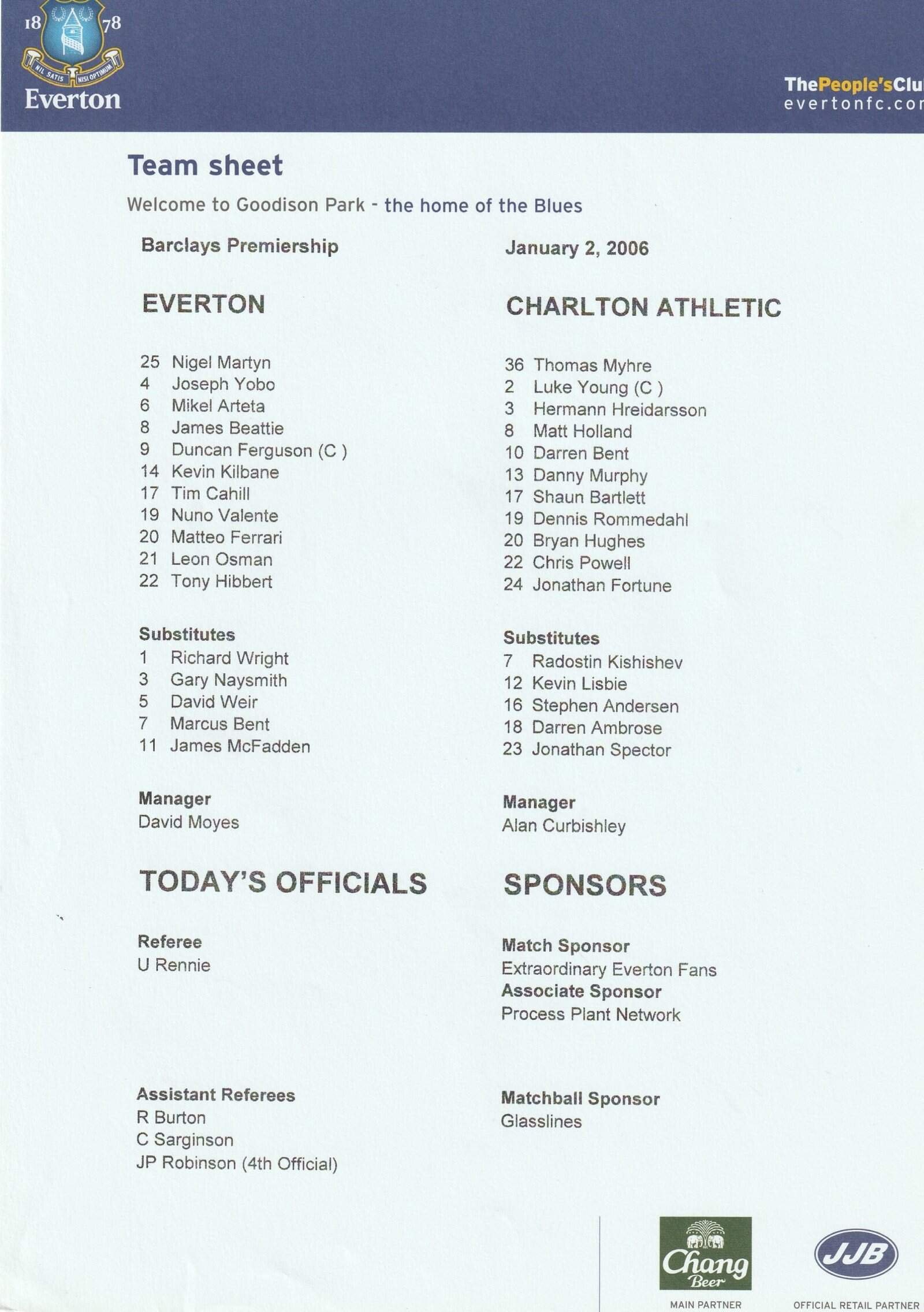 Match: Everton v Charlton Athletic Competition: Barclays Premiership Date: 02-01-2006 Comments: Rating: 4 Condition: Very good Weight in grams: 20