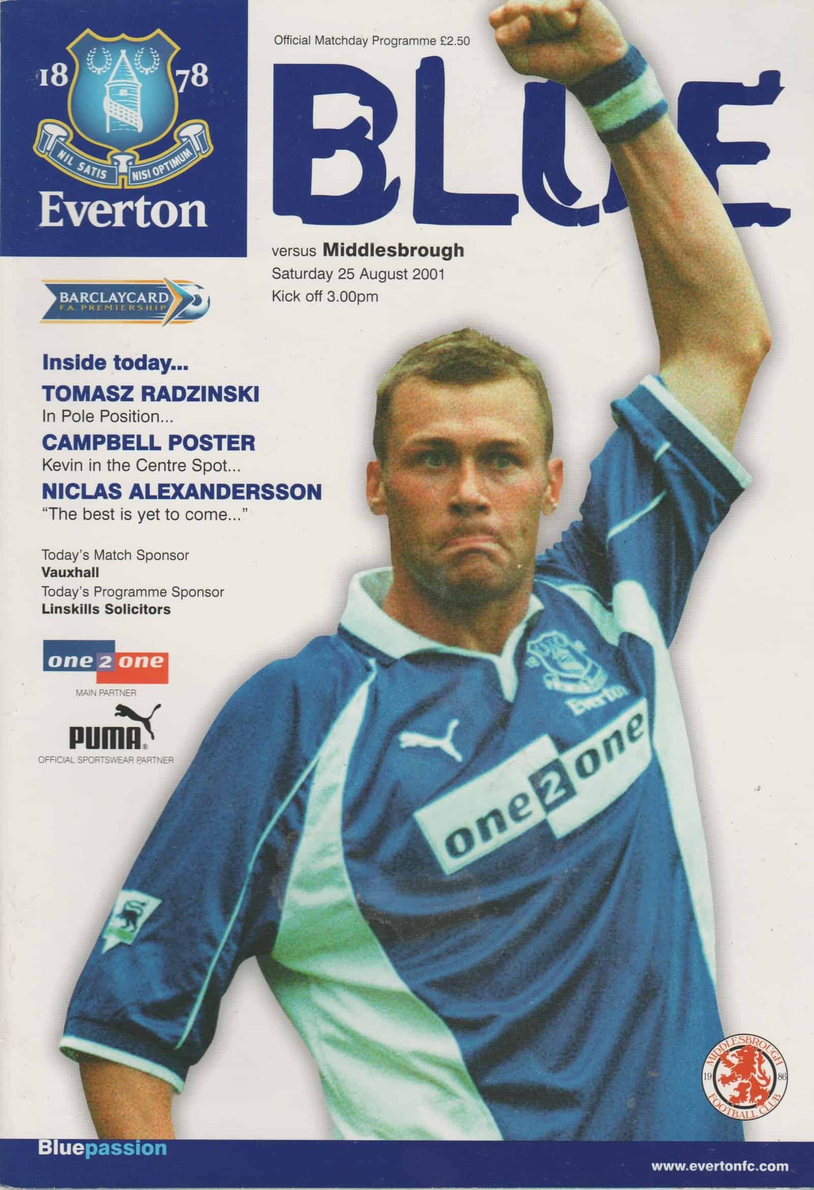 Match: Everton v Middlesbrough Competition: Premier League Date: 25-Aug-2001 Comments: Rating: 4 Condition: Very good Weight in grams: 120