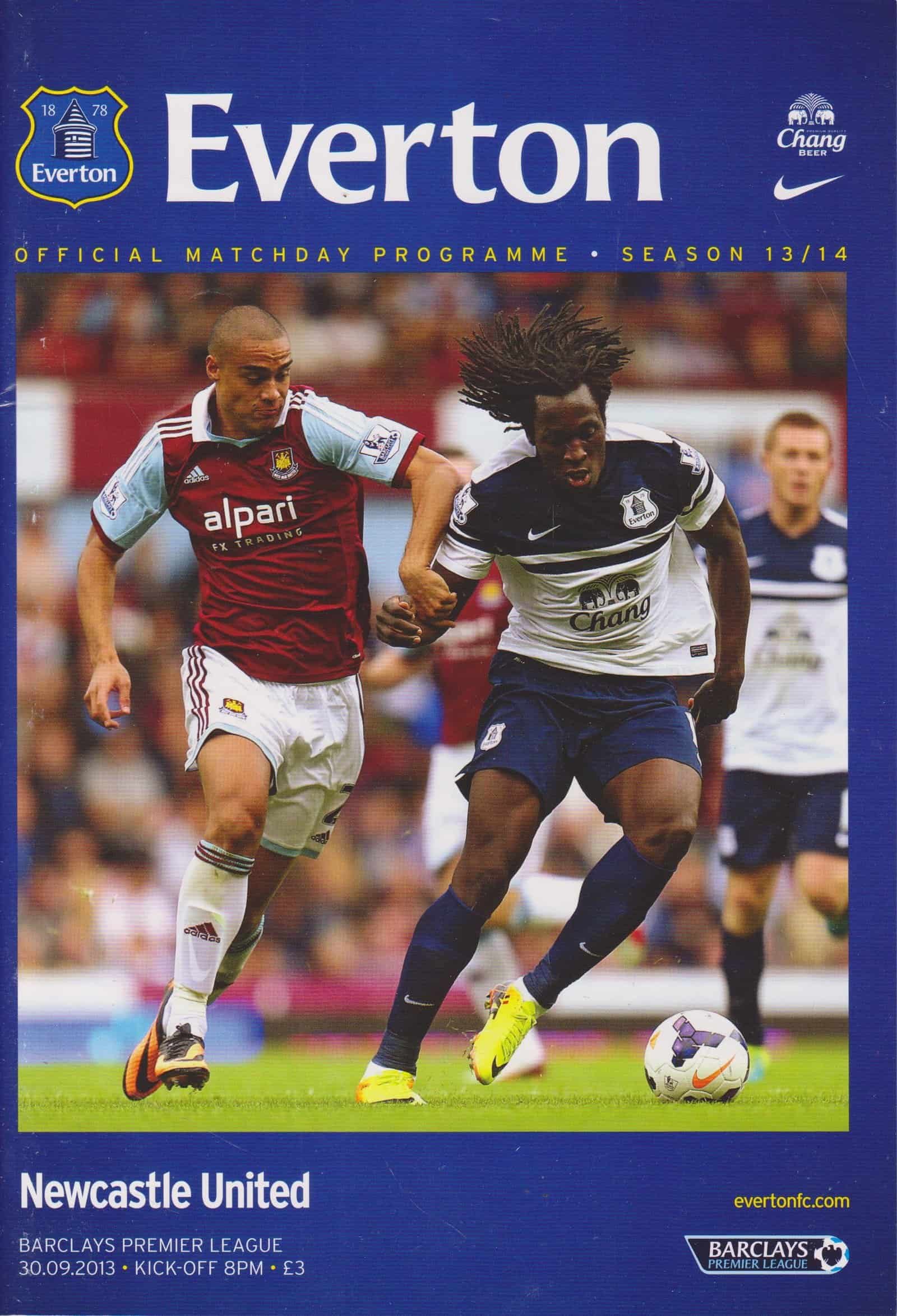 Match: Everton v Newcastle United Competition: Premier League Date: 30-09-2013 Comments: Rating: 4 Condition: Slight fold on spine Weight in grams: 200