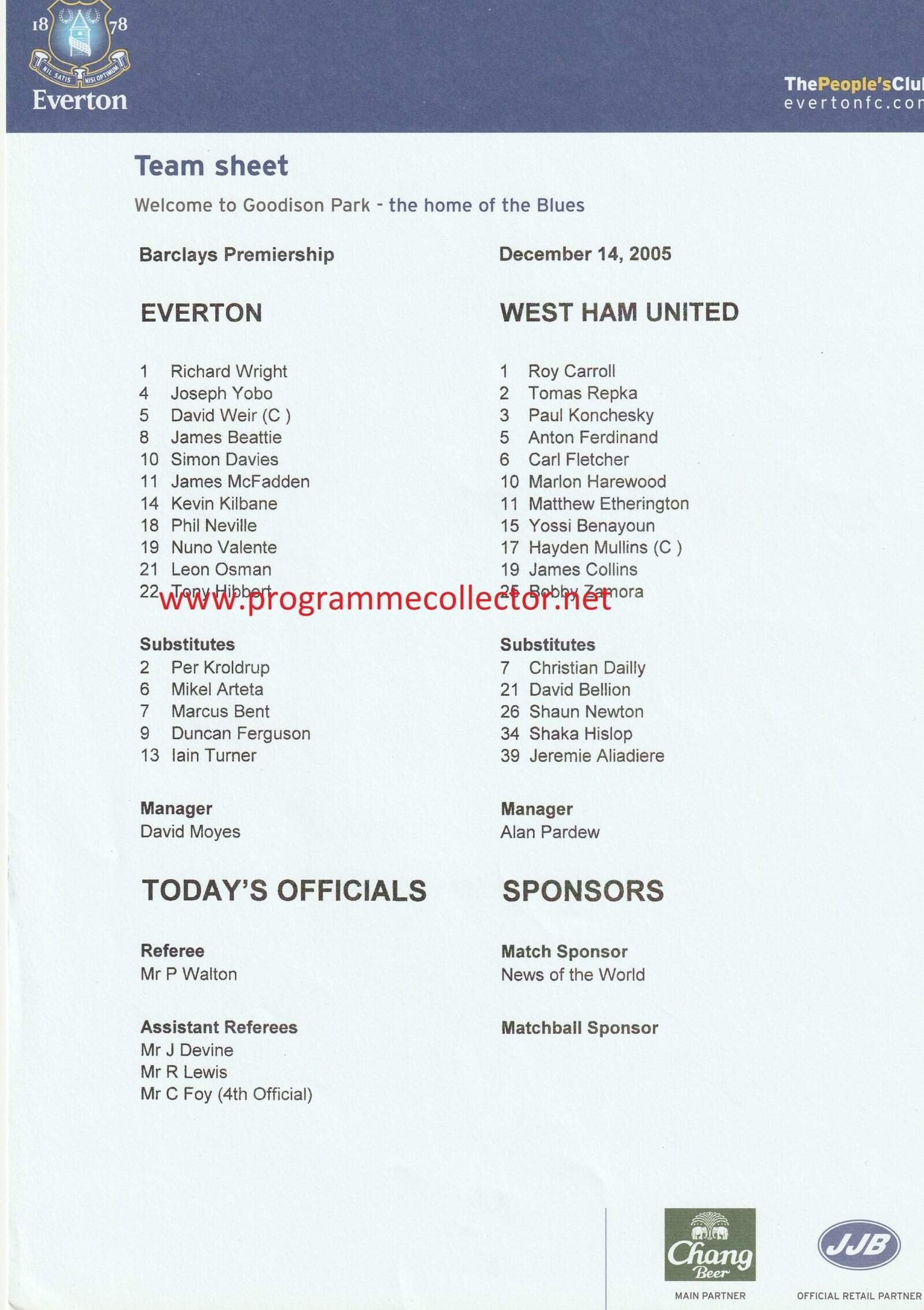 Match: Everton v West Ham United Competition: Barclays Premiership Date: 14-Dec-2005 Comments: Rating: 4 Condition: Very good Weight in grams: 20