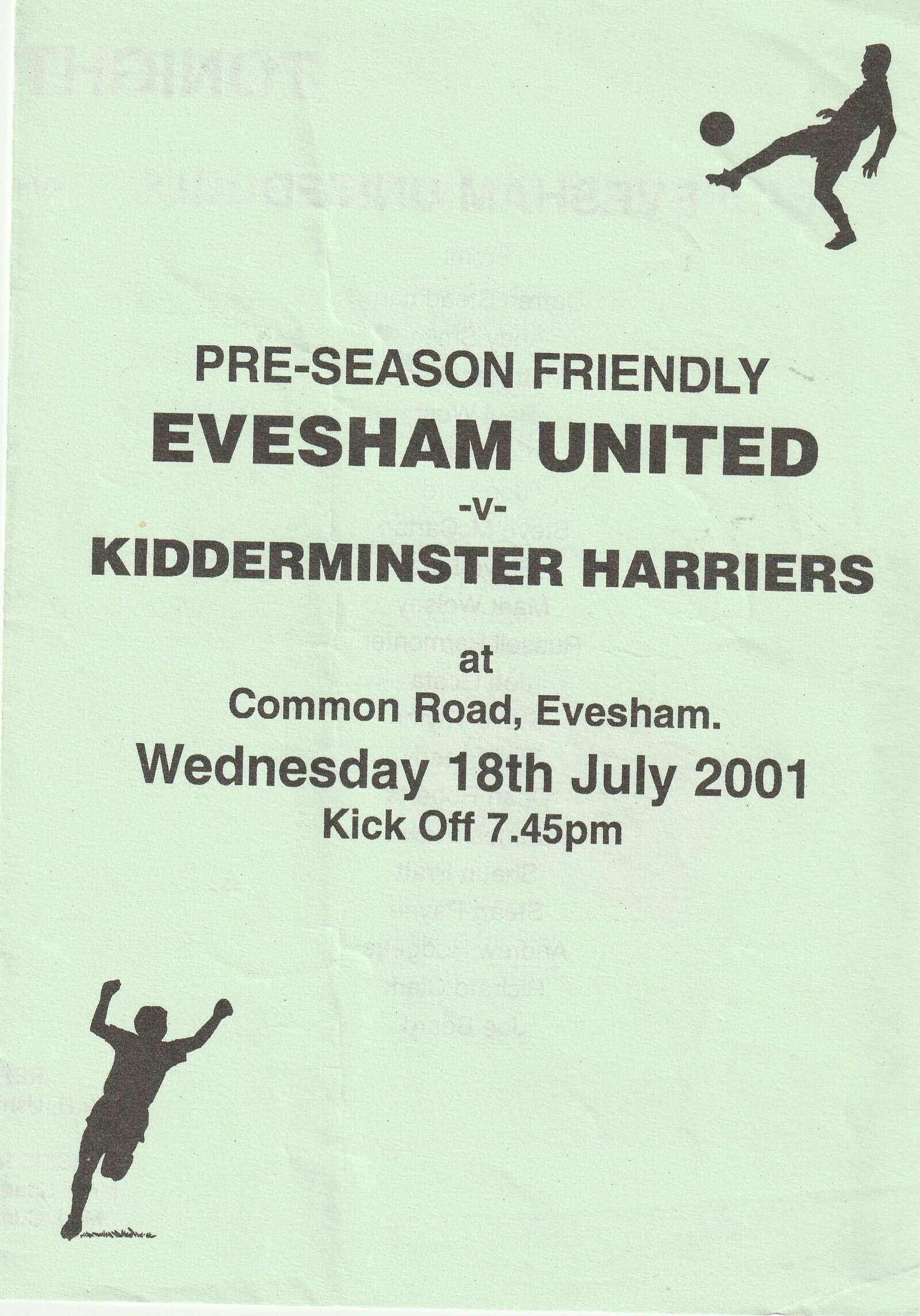 Match: Evesham United v Kidderminster Harriers Competition: Friendly Date: 18-Jul-2001 Comments: 4 page issue Rating: 3 Condition: Light fold, soiling on back page Weight in grams: 20