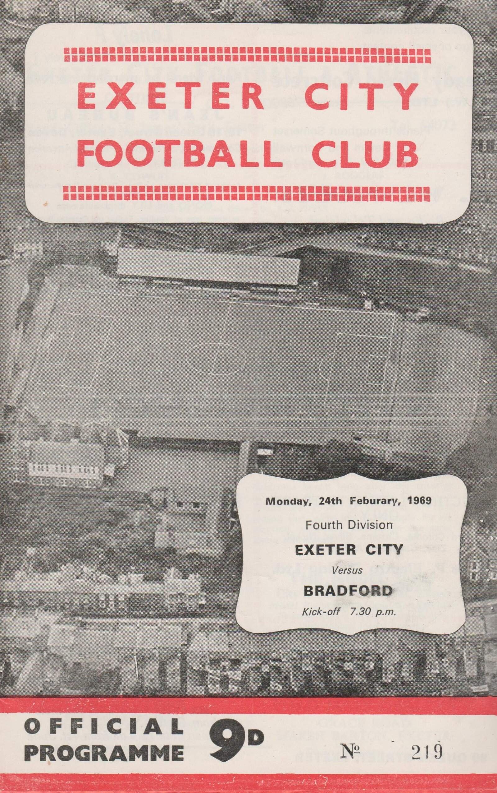 Match: Exeter City v Bradford Park Avenue Competition: League Division 4 Date: 24-Feb-1969 Comments: Rating: 3 Condition: Rusty staple, faint fold Weight in grams: 60