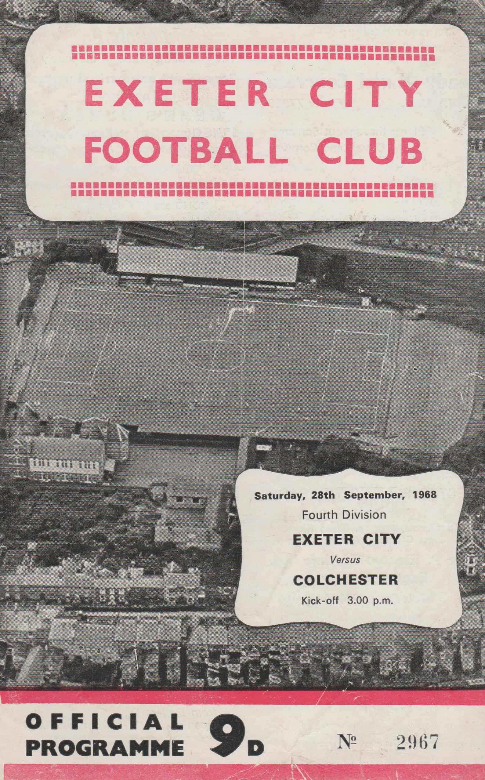Match: Exeter City v Colchester United Competition: League Division 4 Date: 28-Sep-1968 Comments: Rating: 3 Condition: Slight fold, rusty staples, light marks on back, slight tear on cover Weight in grams: 60