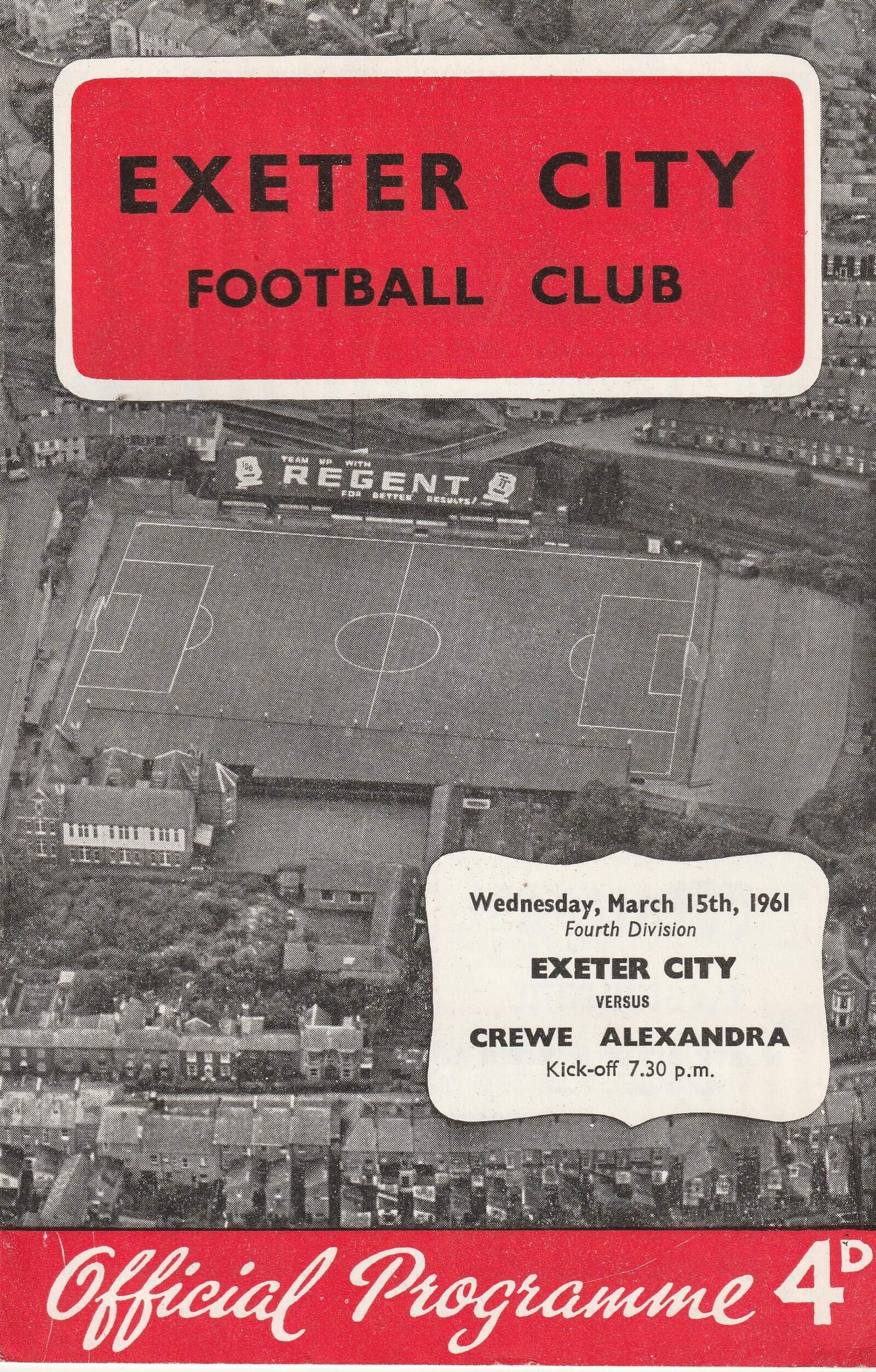 Match: Exeter City v Crewe Alexandra Competition: League Division 4 Date: 15-Mar-1961 Comments: Rating: 3 Condition: Slight staple rust Weight in grams: 40