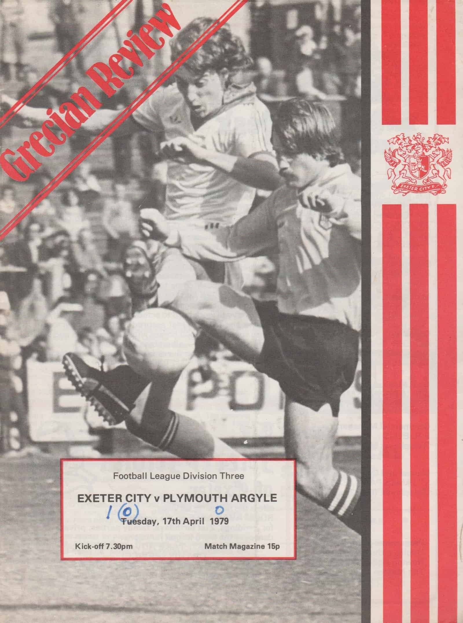 Match: Exeter City v Plymouth Argyle Competition: League Division 3 Date: 17-Apr-1979 Comments: Rating: 3 Condition: Fold, score on face, team changes, marks on back, slight fray to edges Weight in grams: 60