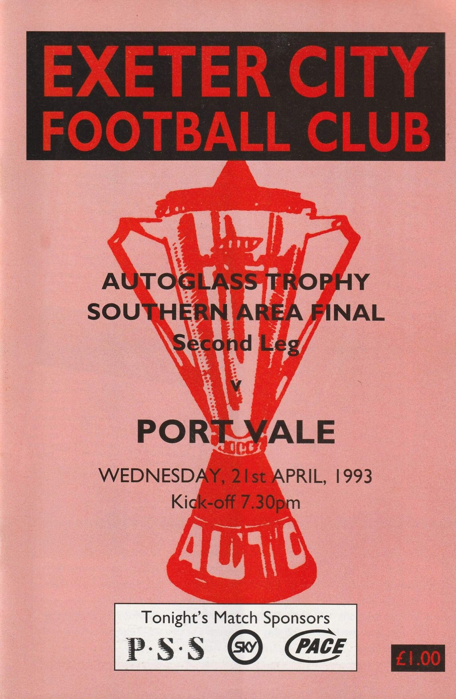Match: Exeter City v Port Vale Competition: Autoglass Trophy Southern Area Final 2nd leg Date: 21-Apr-1993 Comments: Rating: 4 Condition: Very good Weight in grams: 140