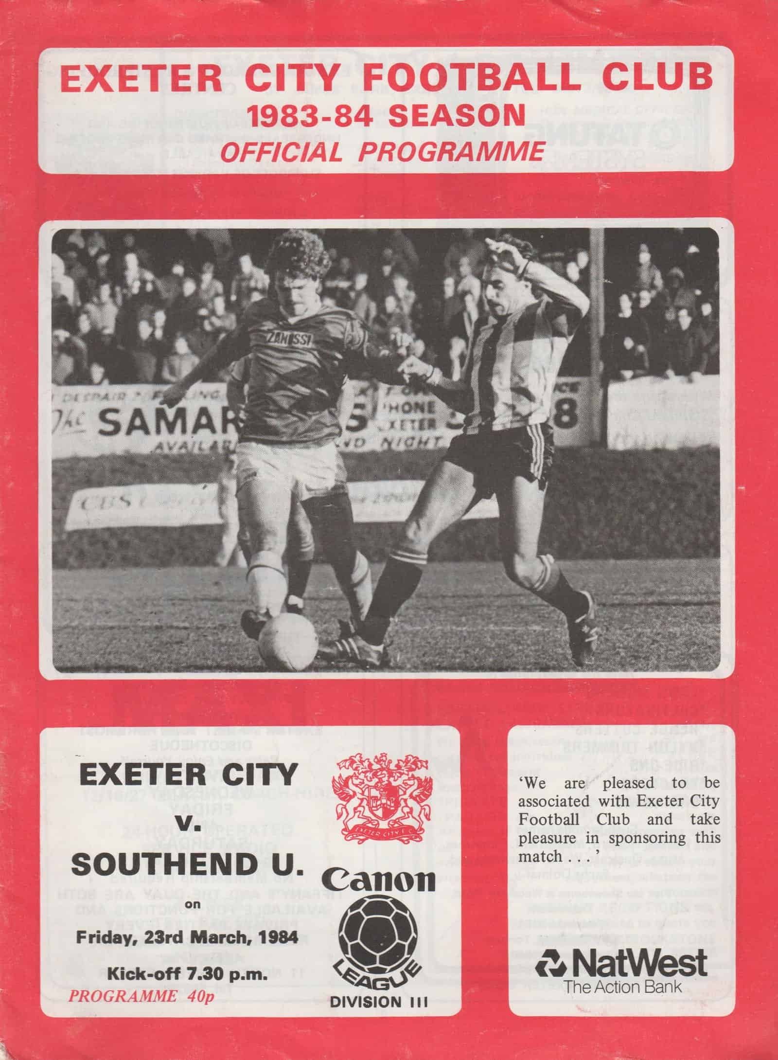 Match: Exeter City v Southend United Competition: League Division 3 Date: 23-Mar-1984 Comments: Rating: 4 Condition: Very good Weight in grams: 100