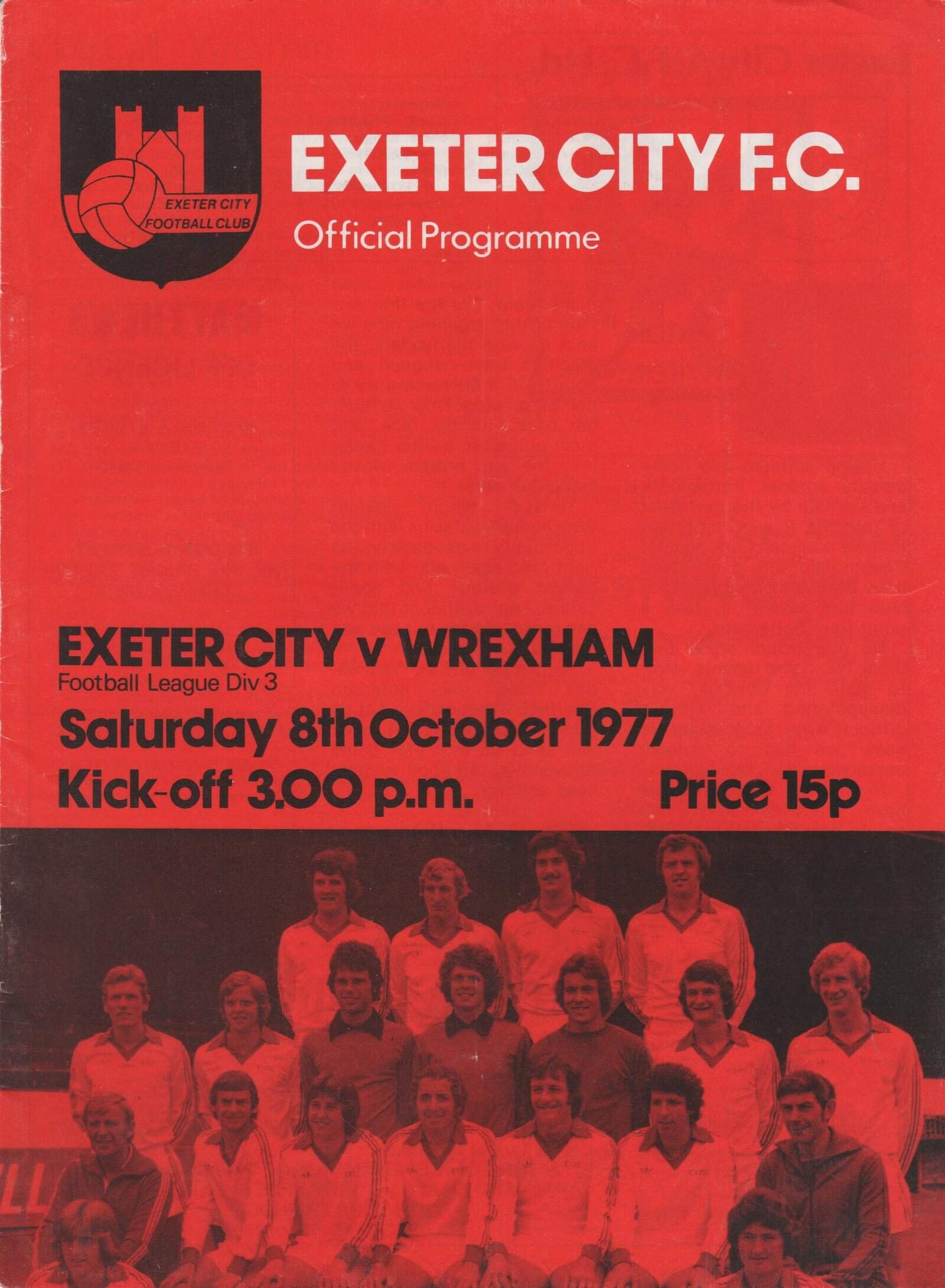 Match: Exeter City v Wrexham Competition: League Division 3 Date: 08-Oct-1977 Comments: Rating: 4 Condition: Faint fold, team changes Weight in grams: 60