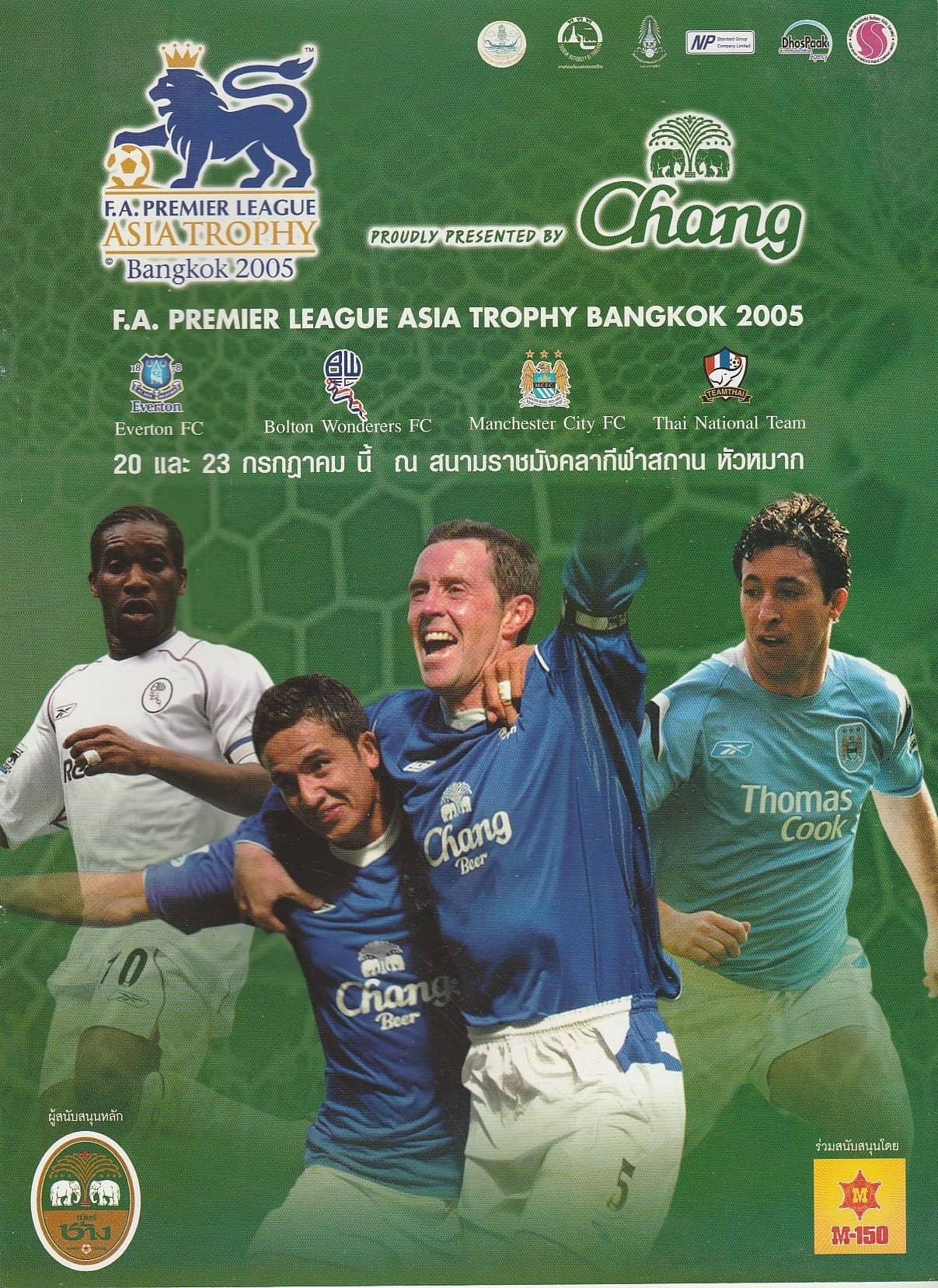 Match: FA Premier League Asia Trophy 2005 Competition: Tournament Date: 20/23-Jul-2005 Comments: Features Everton, Bolton Wanderers, Manchester City, Thai National Team Rating: 3 Condition: Light fold on cover Weight in grams: 160