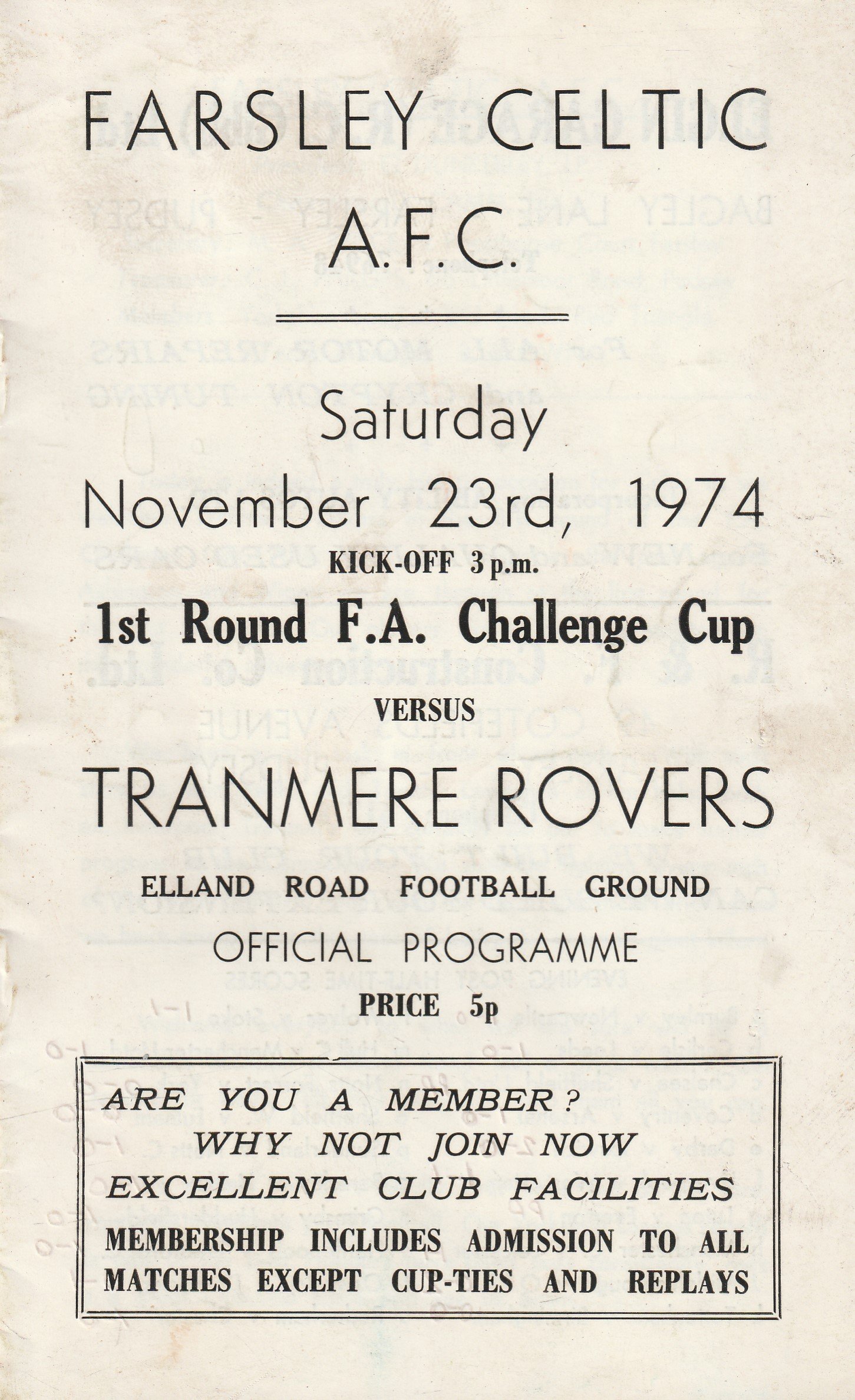 Match: Farsley Celtic v Tranmere Rovers Competition: FA Cup 1st Round Date: 23-Nov-1974 Comments: Played at Leeds United FC Rating: 3 Condition: Team changes, soiling on front/back page Weight in grams: 80
