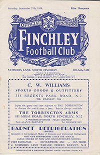 Match: Finchley v Grays Athletic Competition: Athenian League Date: 27-09-1958 Comments: Rating: 4 Condition: Very good Weight in grams: 40