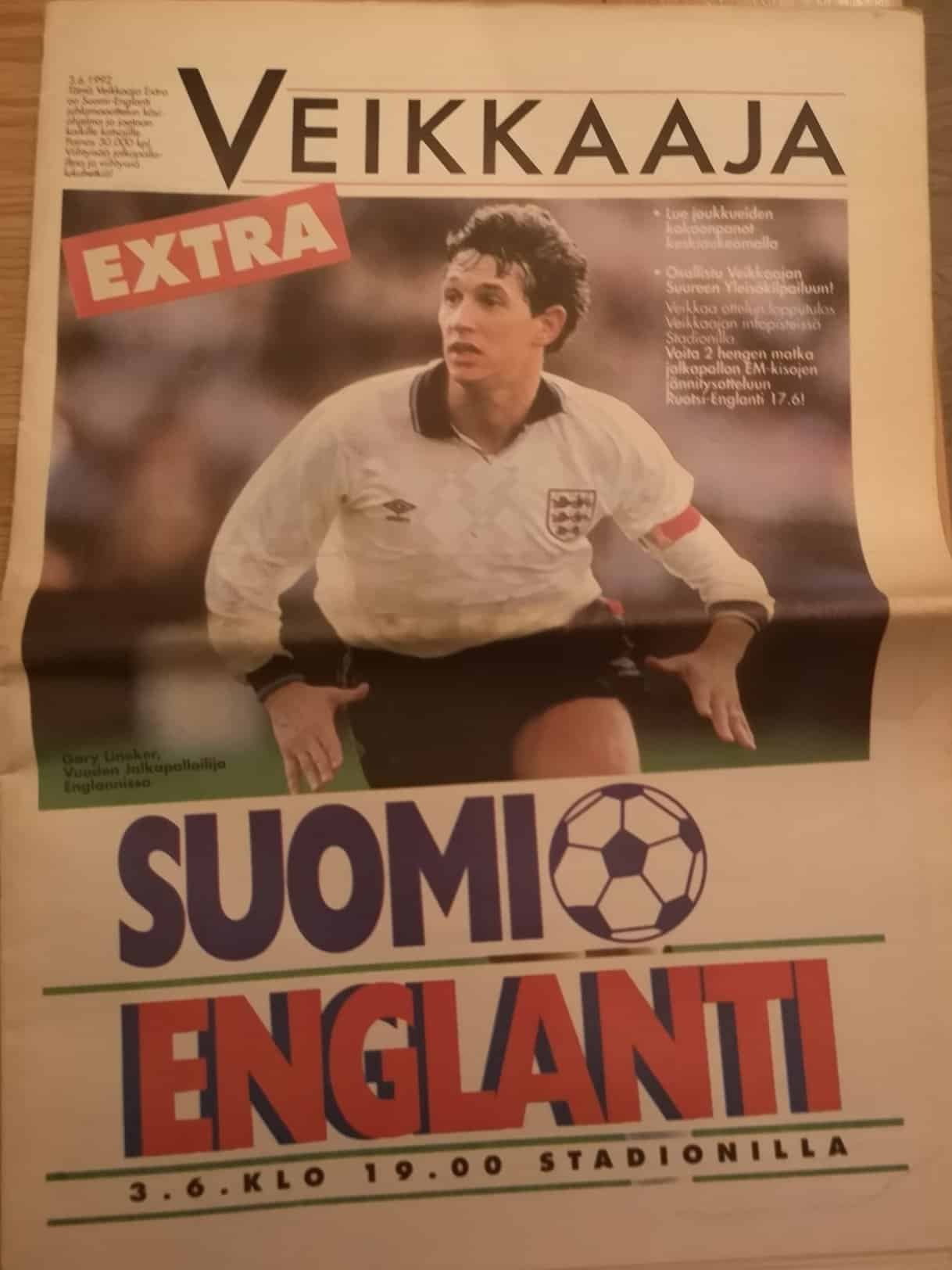Match: Finland v England Competition: International friendly Date: 03-Jun-1992 Comments: Tabloid size with fold Rating: 4 Condition: Very good Weight in grams: 300