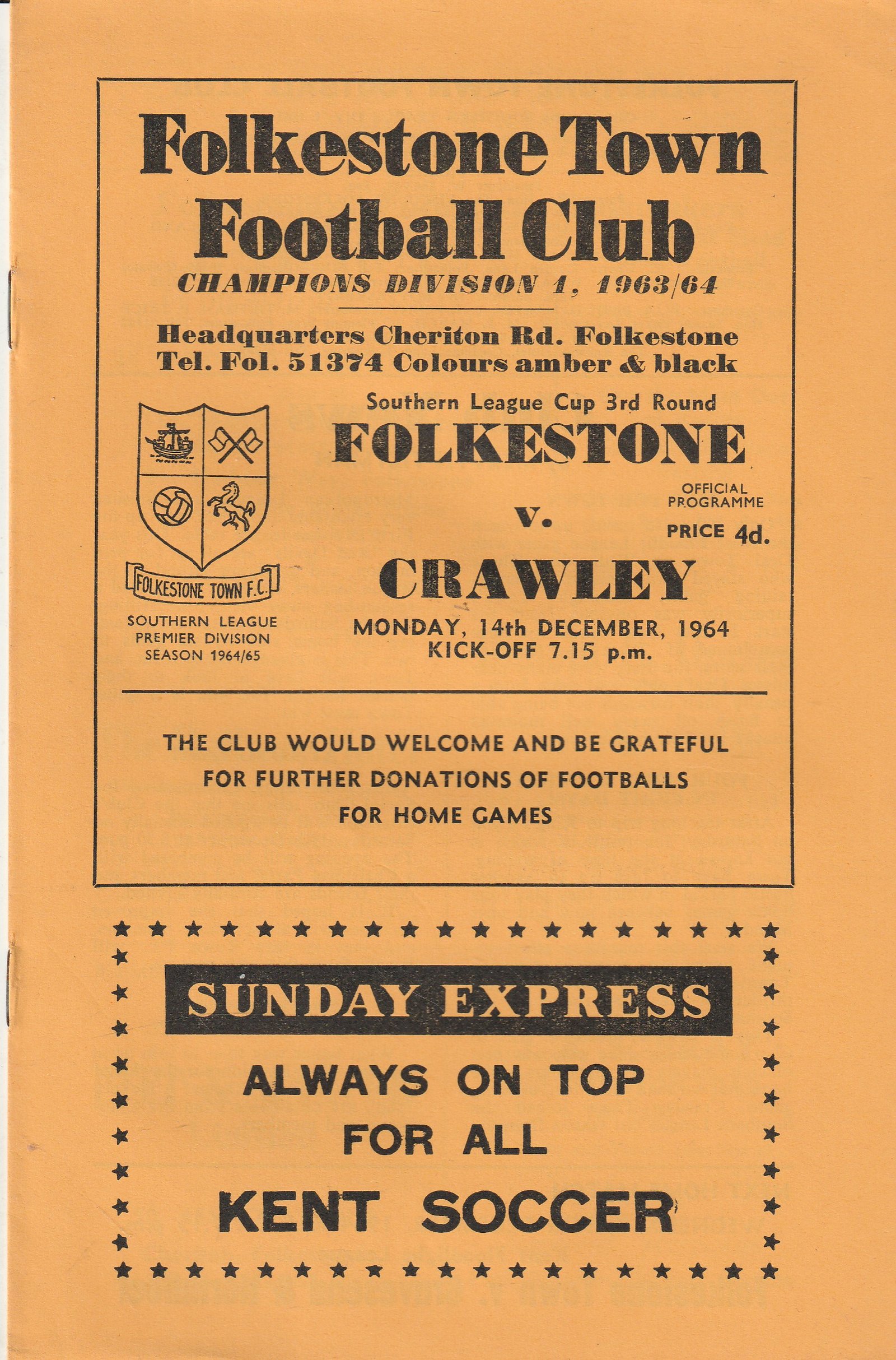 Match: Folkestone & Shepway v Crawley Town Competition: Southern League Cup 3rd Round Date: 14-Dec1964 Comments: Rating: 4 Condition: Very good Weight in grams: 40