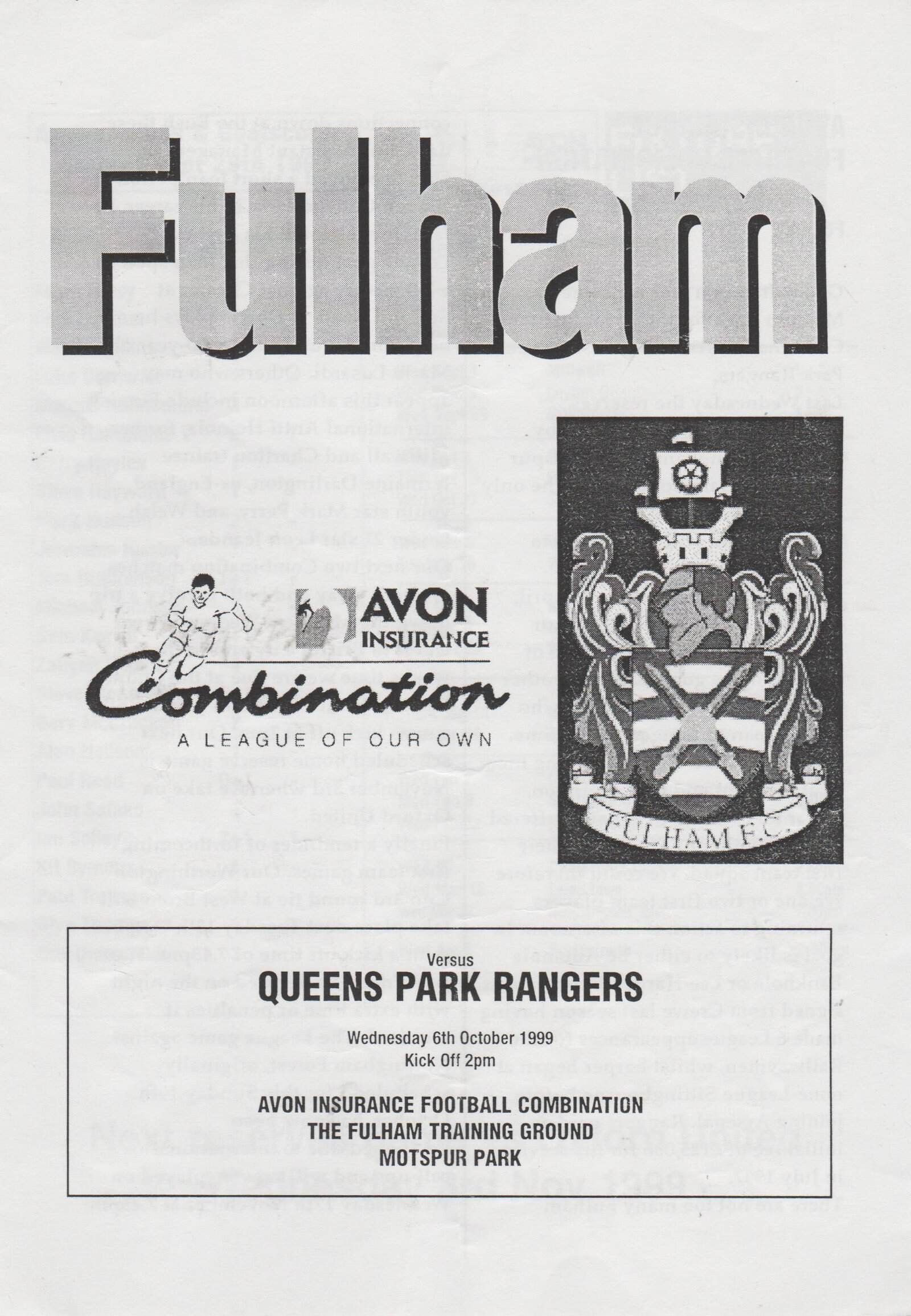 Match: Fulham Reserves v Queens Park Rangers Reserves Competition: Football Combination Date: 06-Oct-1999 Comments: 4 page issue Rating: 3 Condition: Fold Weight in grams: 40