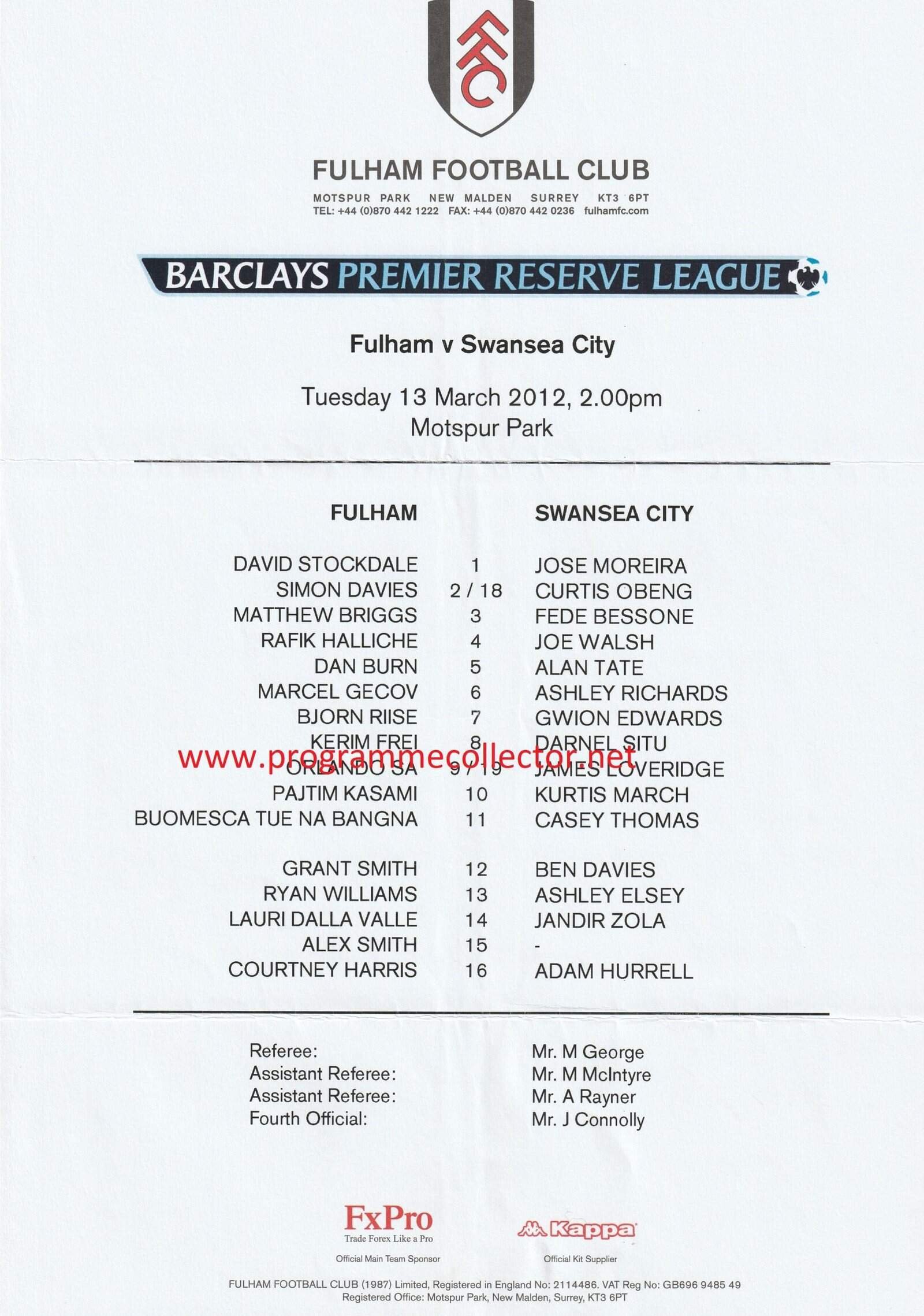 Match: Fulham Reserves v Swansea City Reserves Competition: Barclays Premier Reserve League Date: 13-Mar-2012 Comments: Rating: 3 Condition: Folds Weight in grams: 20