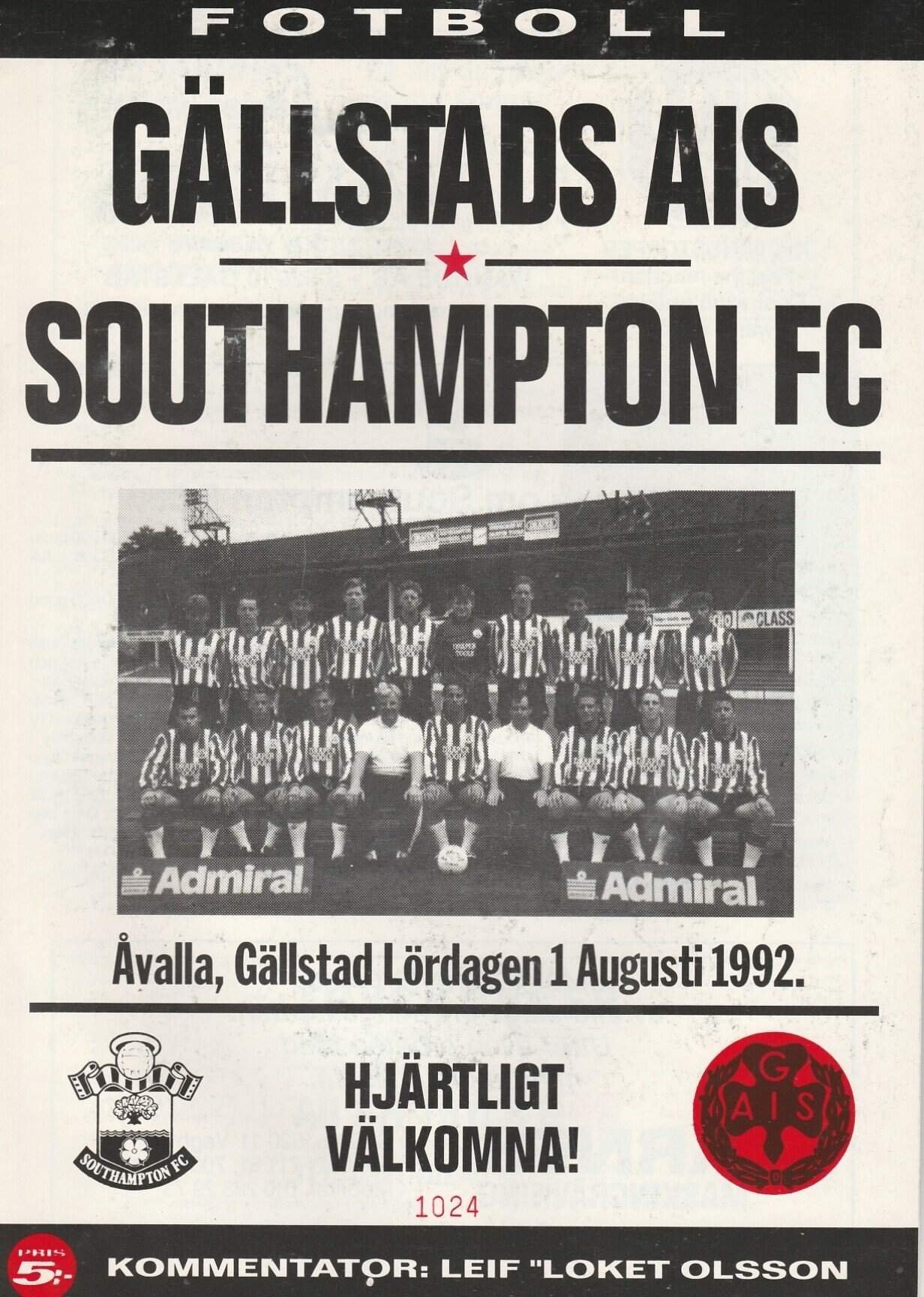 Match: Gällstads AIS v Southampton Competition: Friendly Date: 01-Aug-1992 Comments: Rating: 4 Condition: Very good Weight in grams: 100