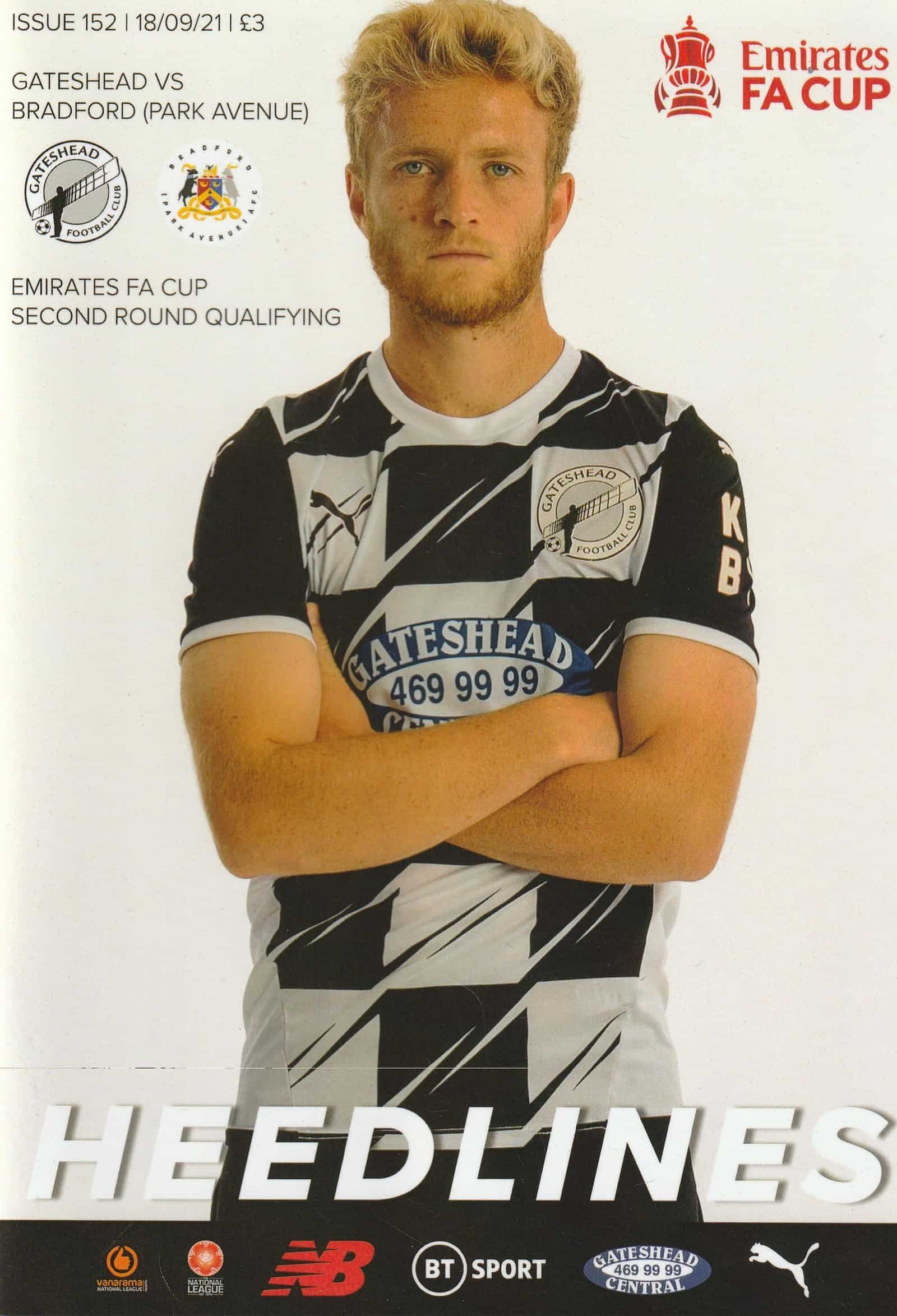 Match: Gateshead v Bradford Park Avenue Competition: FA Cup 2nd Qualifying Round Date: 18-Sep-2021 Comments: Rating: 4 Condition: Very good Weight in grams: 300
