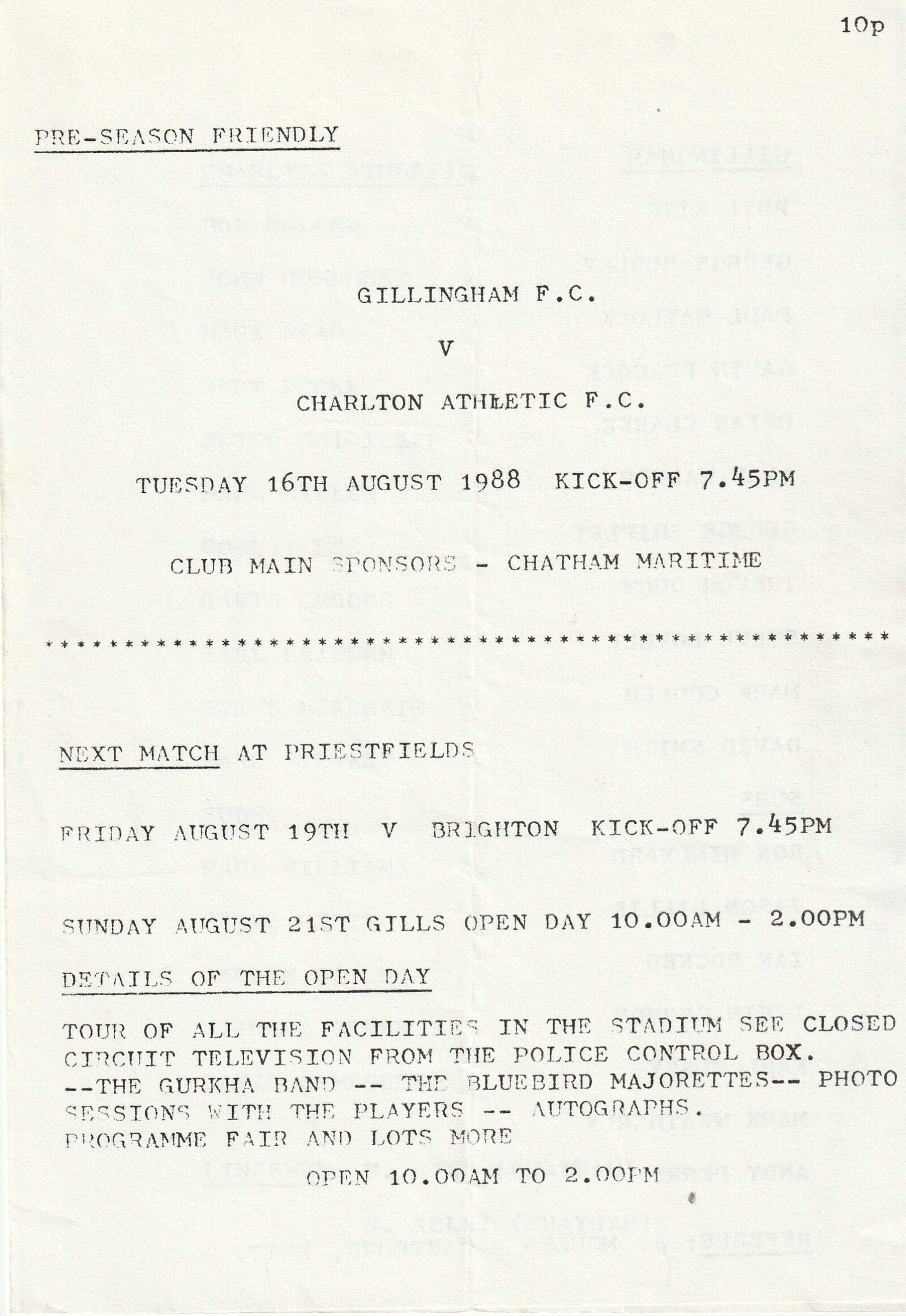 Match: Gillingham v Charlton Athletic Competition: Friendly Date: 16-Aug-1988 Comments: 4 page issue Rating: 3 Condition: Fold Weight in grams: 20