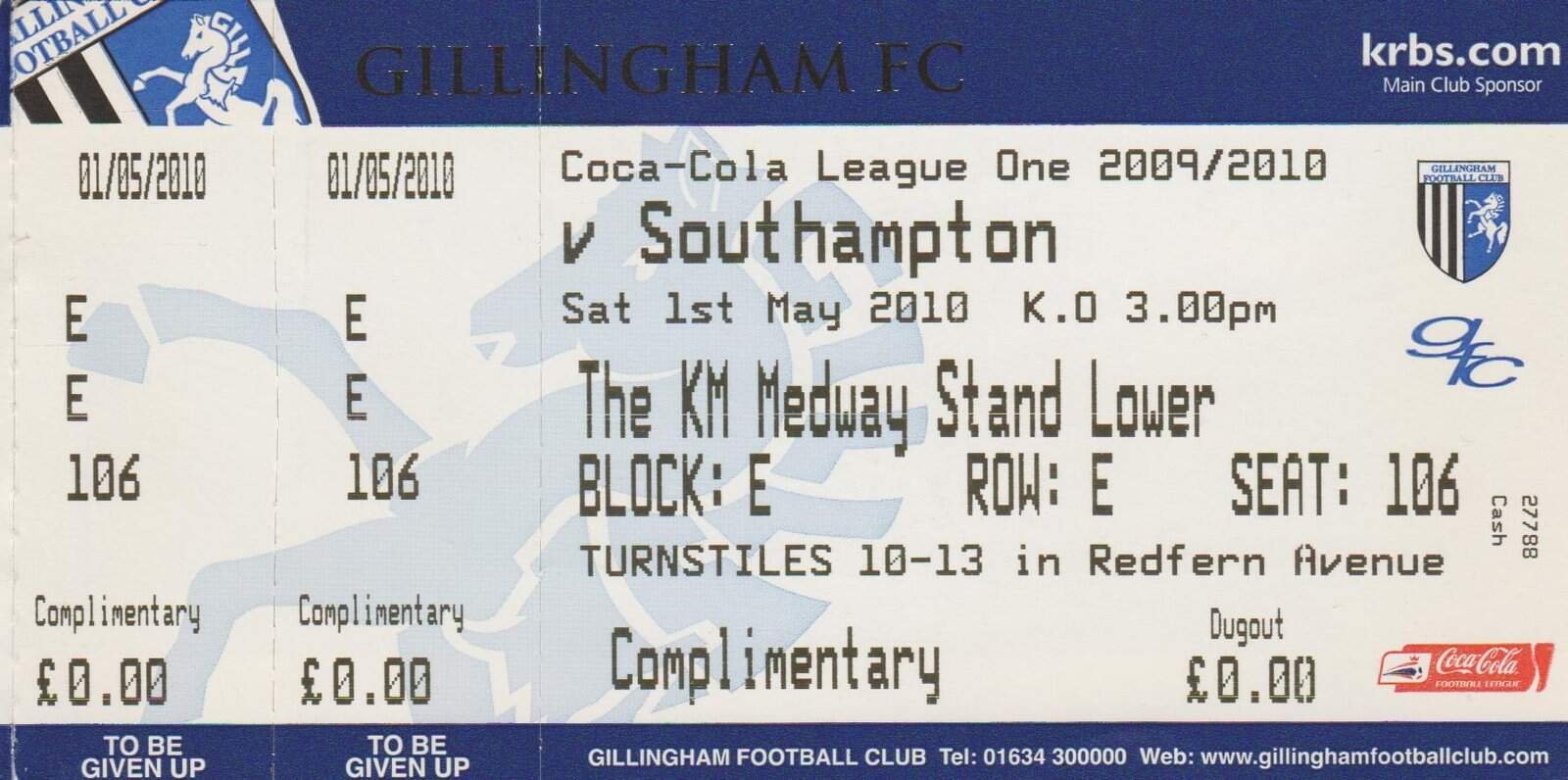 Match: Gillingham v Southampton Competition: Coca Cola League 1 Date: 01-May-2010 Comments: Rating: 4 Condition: Very good Weight in grams: 10